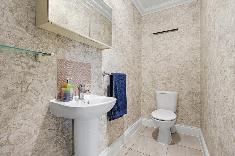 The heart of the home is the impressive kitchen-dining room, set to one end of the property and perfectly arranged for both everyday living and entertaining. The cream, shaker-style kitchen incorporates a range cooker and ample storage, while the dining area easily accommodates a large table for family gatherings and relaxed entertaining. A utility room leads off the kitchen and provides direct access to the rear garden, with a ground floor cloakroom completing the downstairs accommodation.