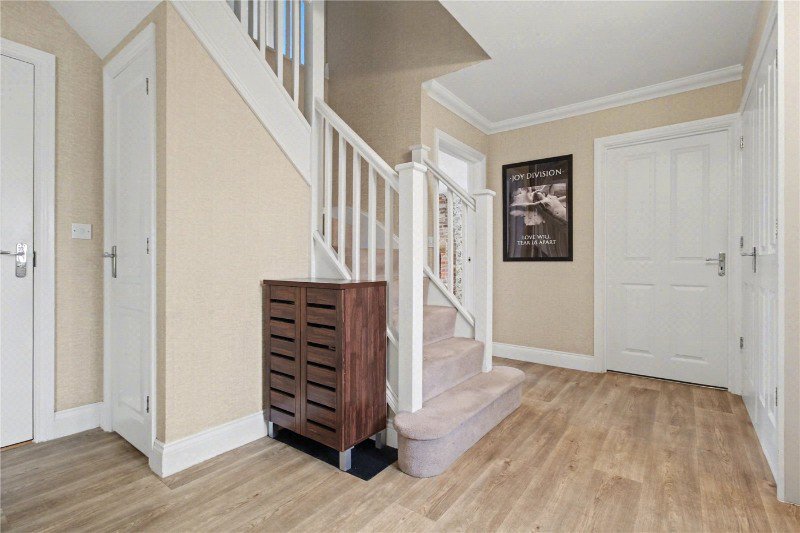Designed with modern family living in mind, the property offers flexible and generously proportioned accommodation throughout. A spacious reception hall creates an immediate sense of arrival, with a turning staircase rising to the first floor and useful understairs storage. To the front of the house is a versatile room currently suited as a study or family snug, ideal for home working or quiet retreat.