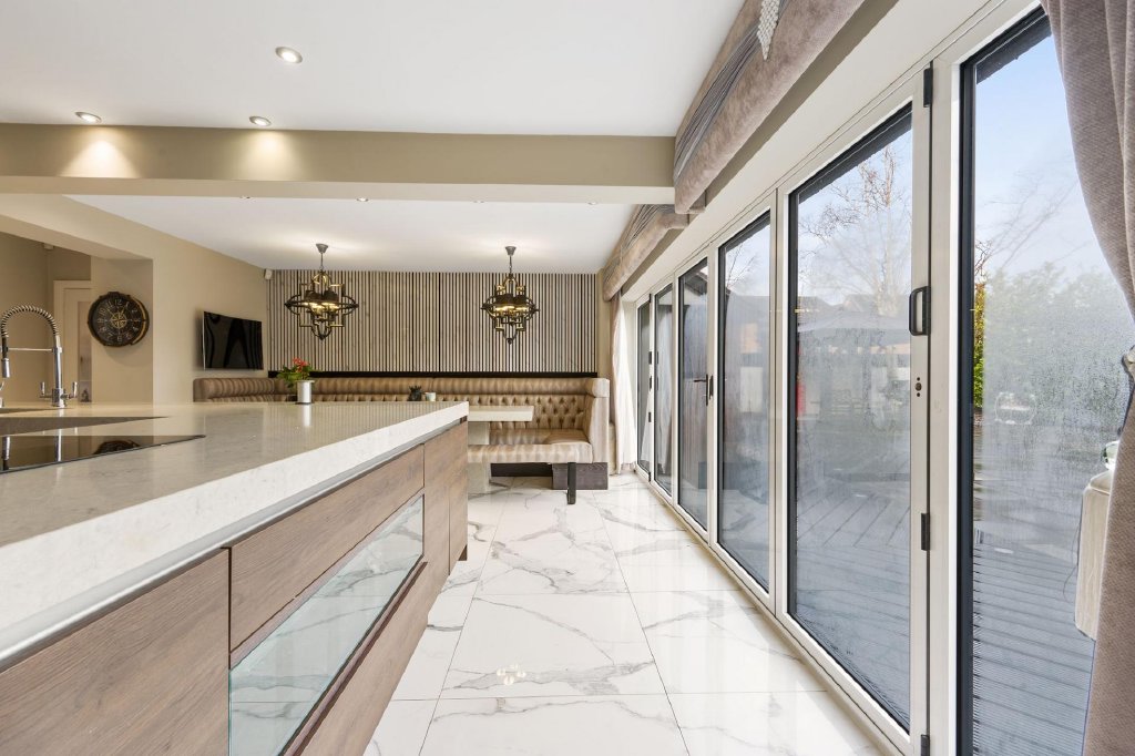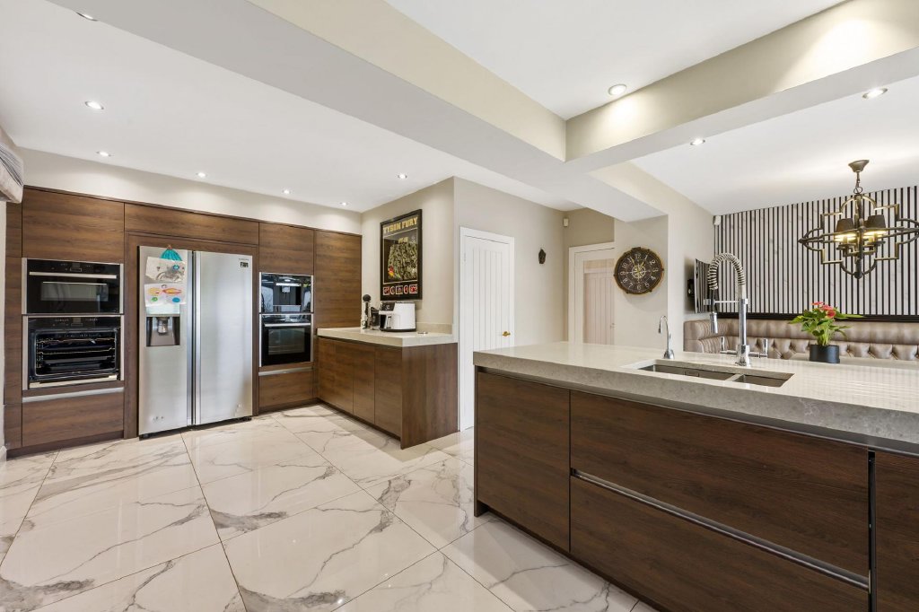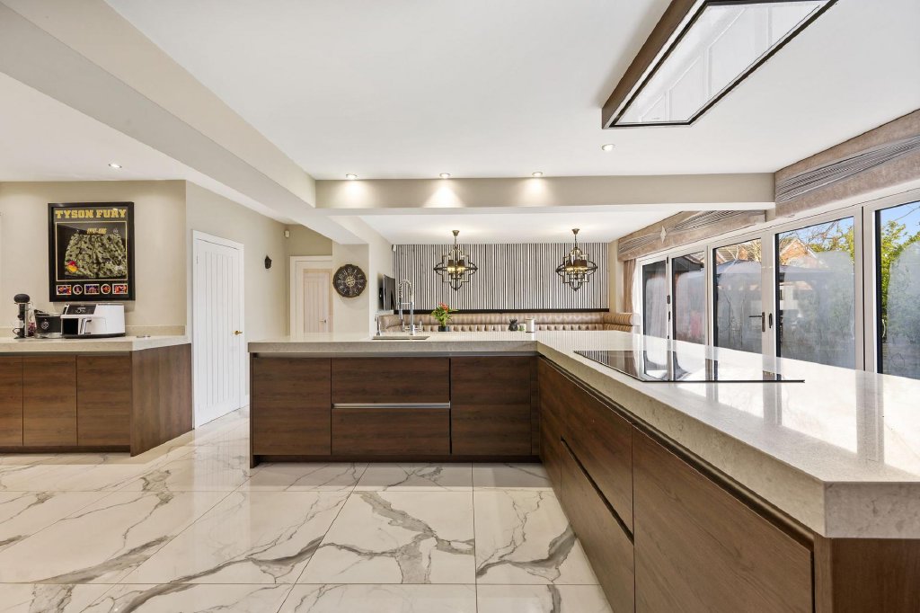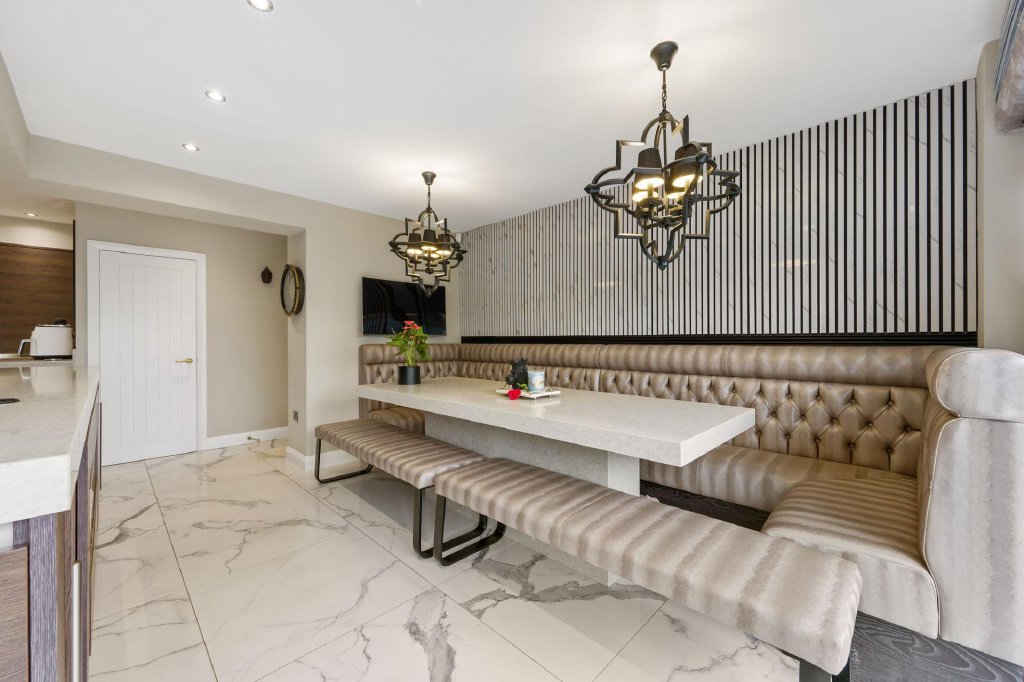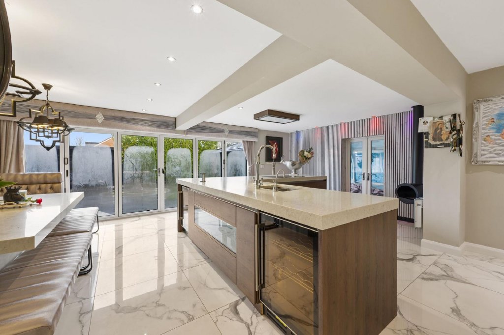 At the heart of the home lies a spectacular open-plan dining kitchen, beautifully appointed with high-gloss cabinetry, granite work surfaces and an impressive L-shaped island incorporating a bespoke dining area. Integrated appliances include twin ovens, coffee machine, wine coolers and a dishwasher, while additional design flourishes such as feature fish tanks and a contemporary oil-burning stove add to the sense of luxury. Bi-folding doors connect the space effortlessly to the rear garden, while glazed doors provide access to the leisure wing.