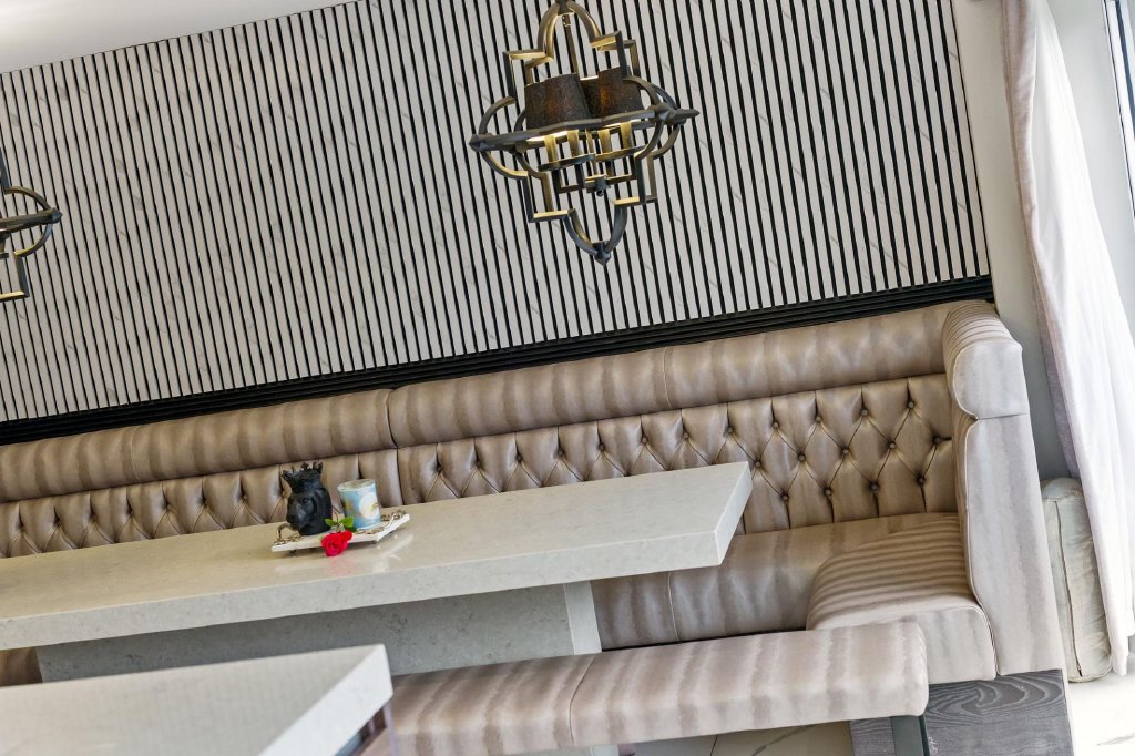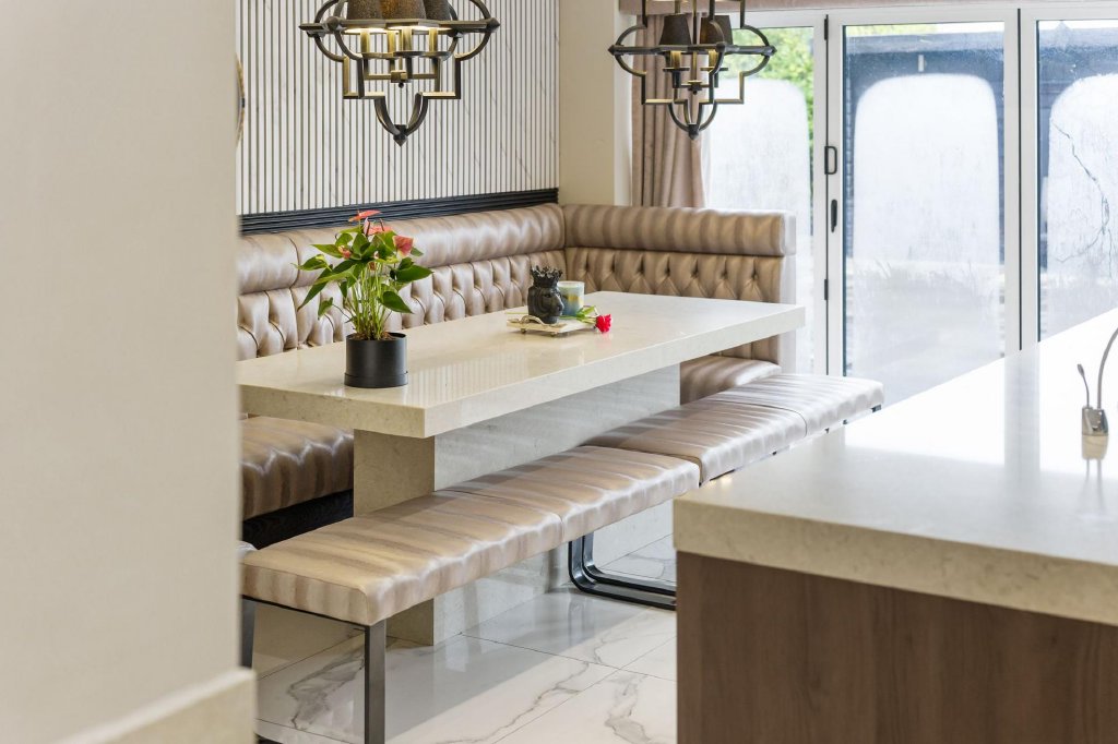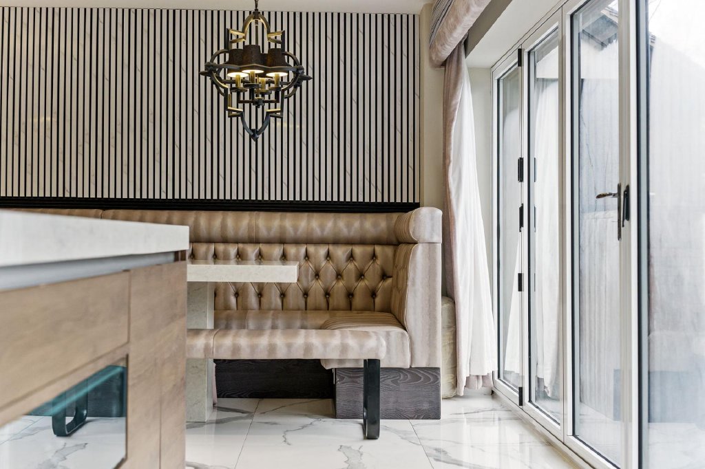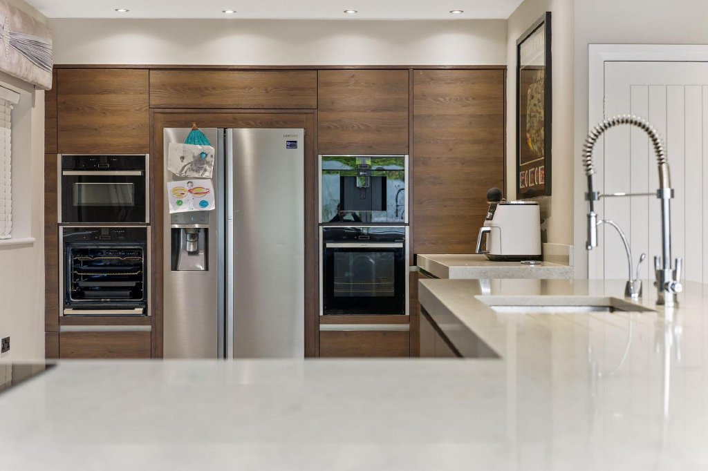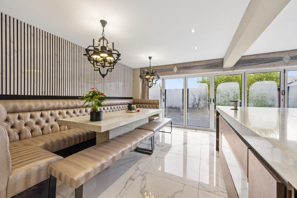 At the heart of the home lies a spectacular open-plan dining kitchen, beautifully appointed with high-gloss cabinetry, granite work surfaces and an impressive L-shaped island incorporating a bespoke dining area. Integrated appliances include twin ovens, coffee machine, wine coolers and a dishwasher, while additional design flourishes such as feature fish tanks and a contemporary oil-burning stove add to the sense of luxury. Bi-folding doors connect the space effortlessly to the rear garden, while glazed doors provide access to the leisure wing.