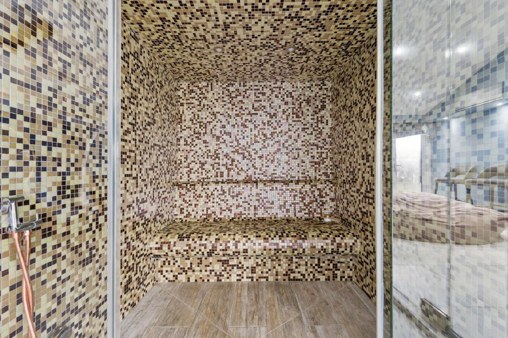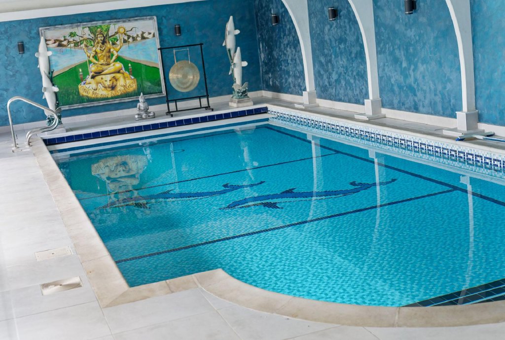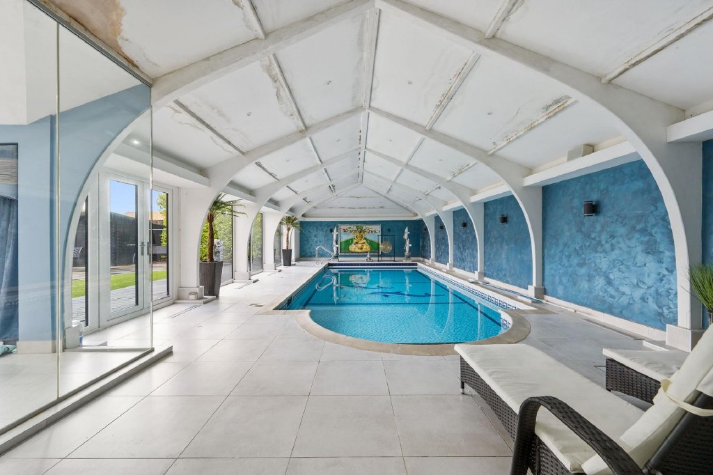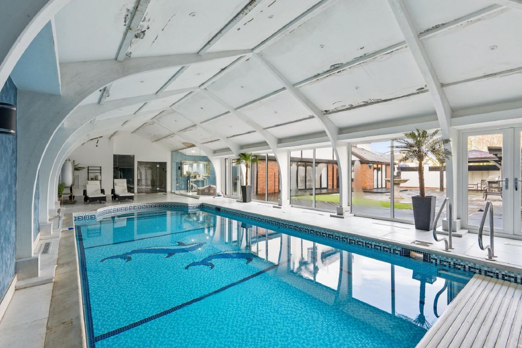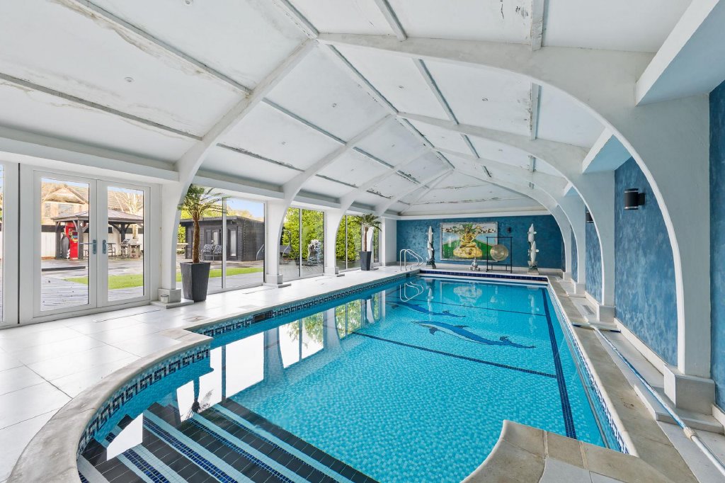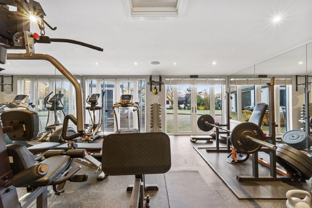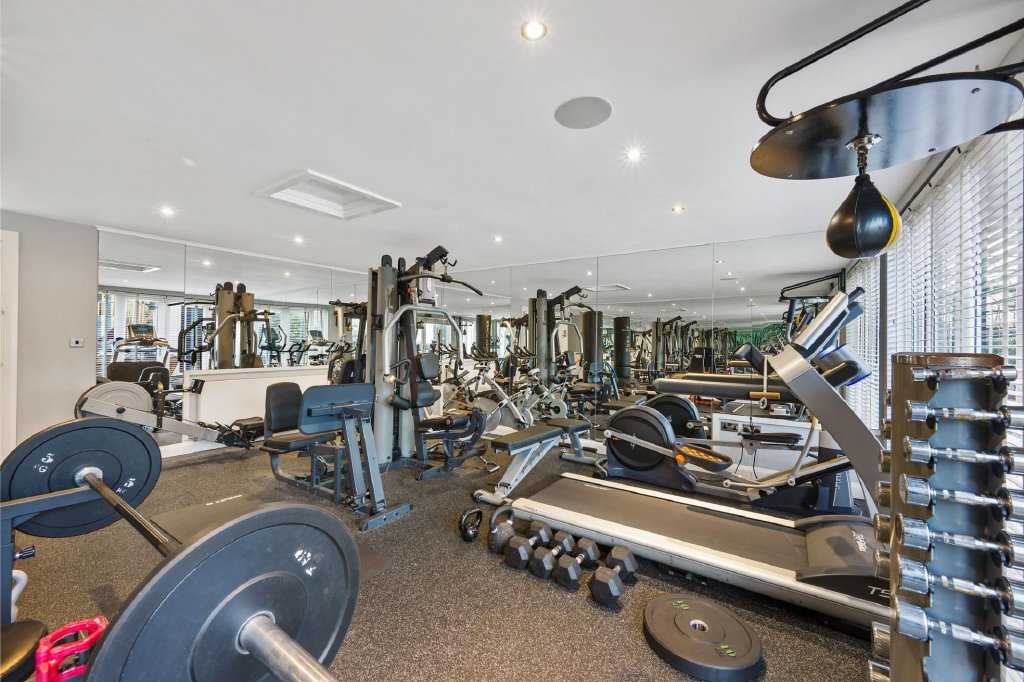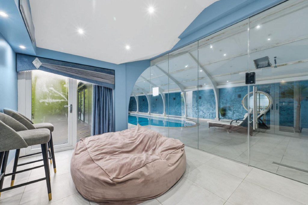 The leisure facilities are truly exceptional. A fully refurbished heated indoor swimming pool forms the centrepiece, complete with mood lighting, garden views and direct access outdoors. Adjacent facilities include a sauna, changing room, luxury shower room, pool control room and a spacious, fully equipped gym—formerly the double garage. A dedicated security control room houses CCTV monitoring and a perimeter alarm system, offering peace of mind alongside a whole-house Sonos sound system.