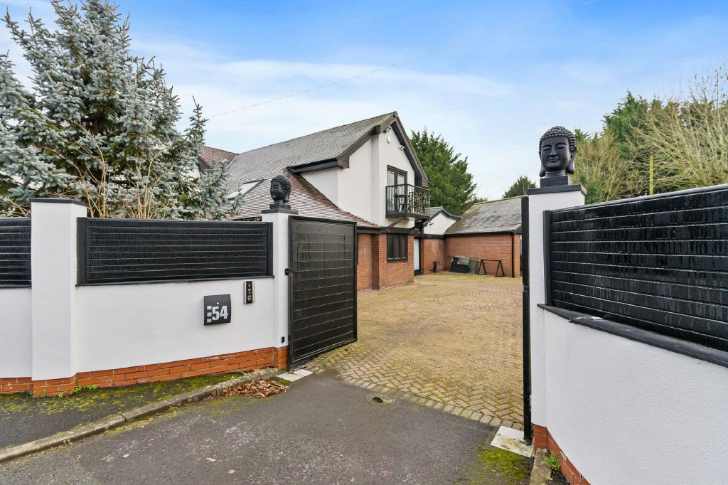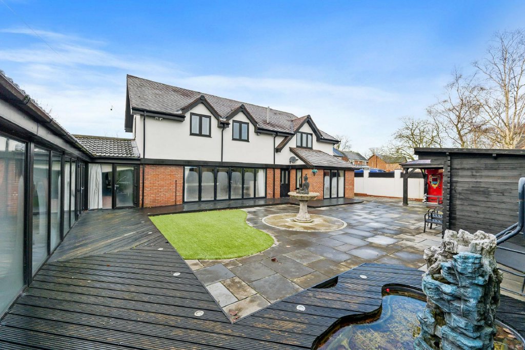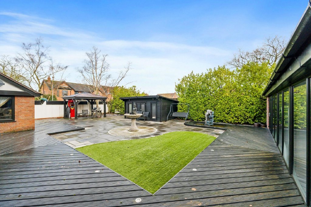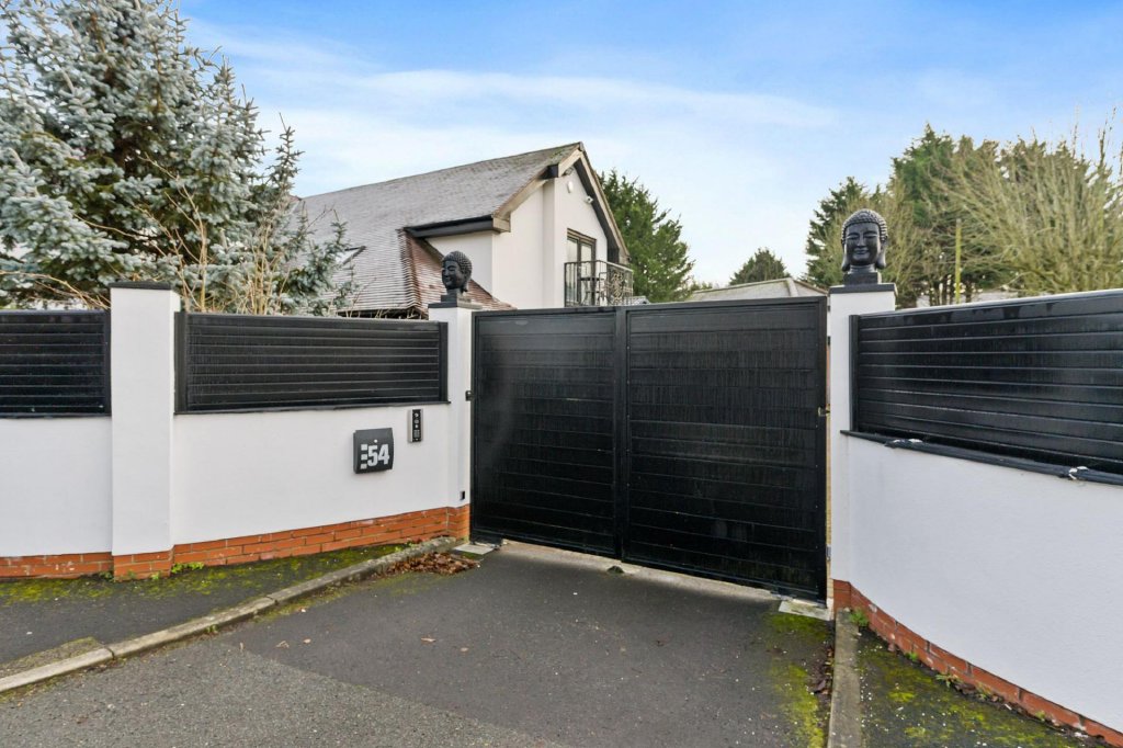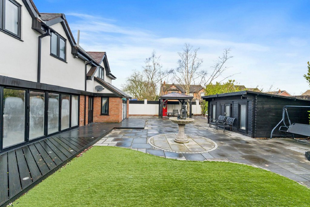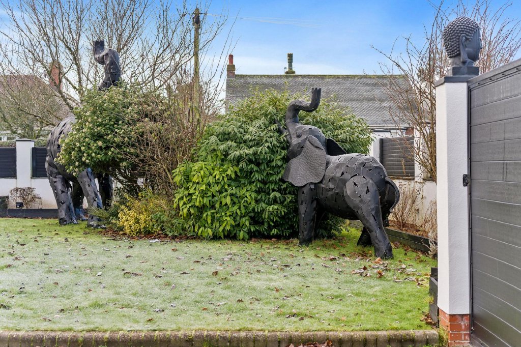 Externally, the property is approached via electric gates opening onto a substantial block-paved driveway providing ample parking, alongside a detached double garage. Landscaped gardens extend to both the front and rear, with the rear garden offering a private, low-maintenance sanctuary featuring decking, a summer house, a fully powered barbecue pergola, water features and ambient lighting. Sculptural metal elephant and gorilla features add a distinctive artistic touch to the grounds.