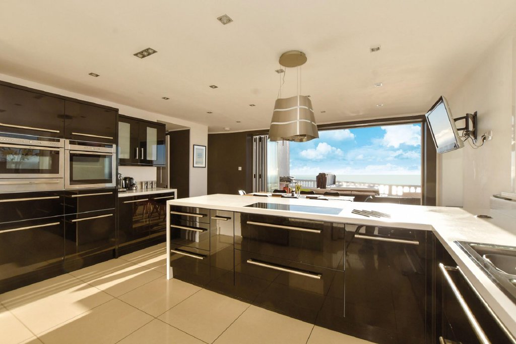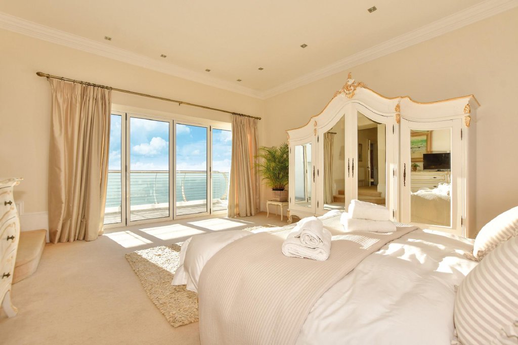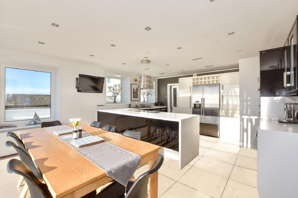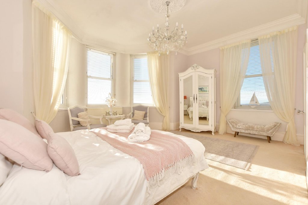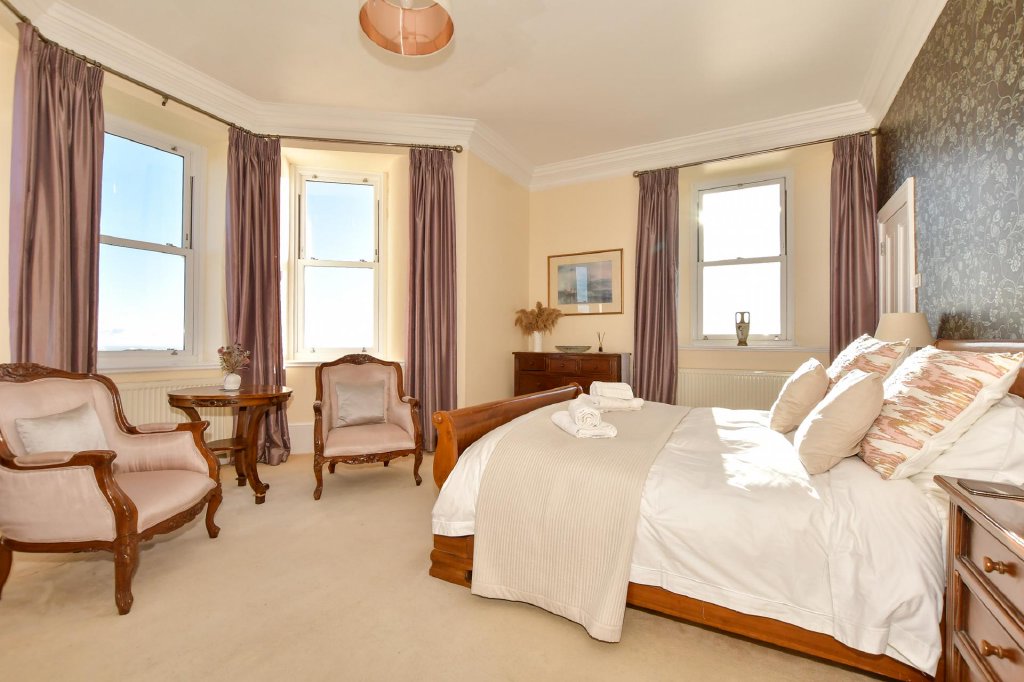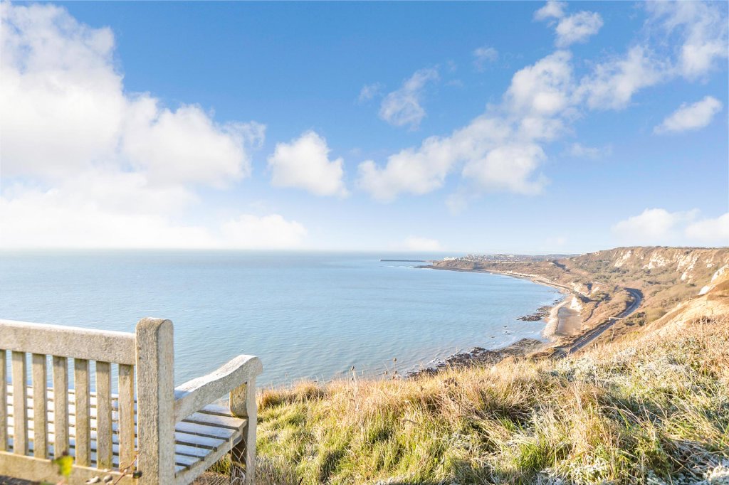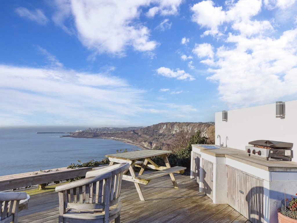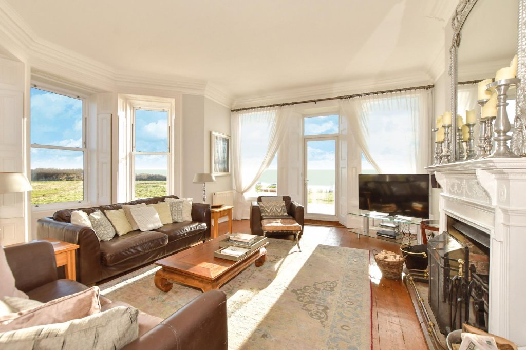 Off the first floor landing there are four individually designed double bedrooms. Three have ensuite facilities and the fourth has access to the adjacent family bathroom with a gorgeous slipper bath and am impressive ceiling rose. Steps lead down to the dual aspect principal bedroom that has four bifold doors to an upper decked balcony where you can sip your morning coffee enjoying the unbeatable views to France on a clear day or just watch the ships sailing by from the comfort of your bed. You could even see the twinkling lights of Cap Gris Nez or Calais as you enjoy a nightcap.