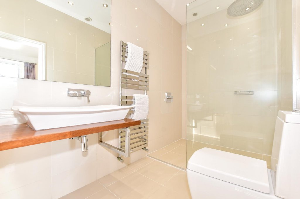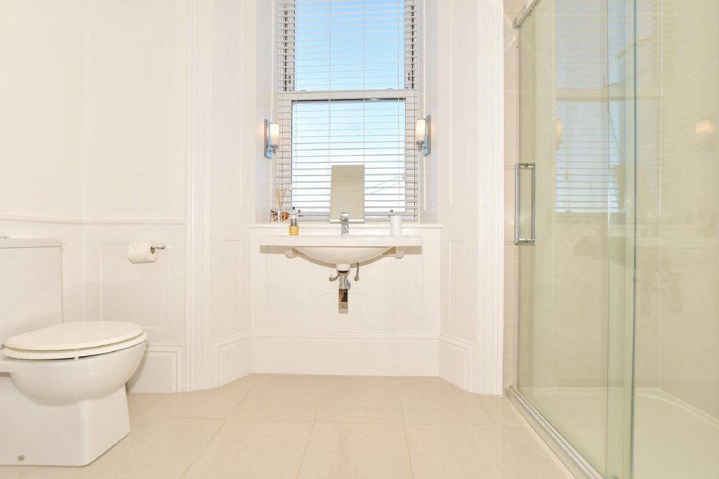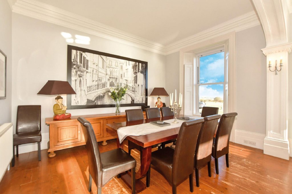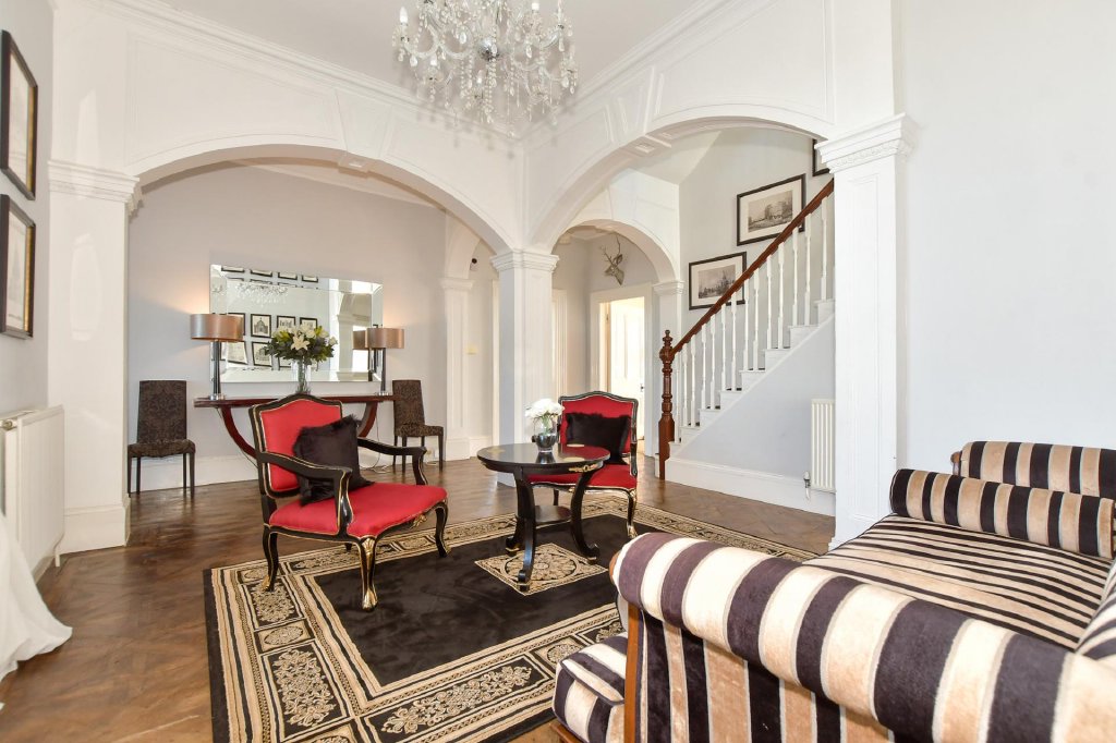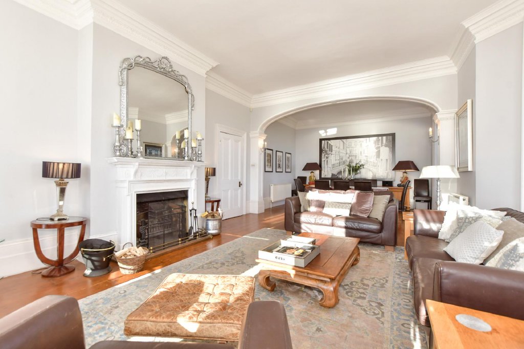 Impressive balustraded steps lead to the glazed double entrance doors that open into the pitched roof vestibule and through double doors to the awe inspiring reception hall where you can imagine guests gathering for cocktails before dinner. This lovely room will take your breath away with its high ceilings, fabulous neo-classical arches, beautiful original oak parquet flooring and delightful Edwardian style staircase. Equally or even more stunning is the very elegant 34ft dual aspect open plan sitting and dining areas with original wood flooring, an open fire you can cosy up to on a cold winter’s evening and a charming wide central archway and a large bay window providing excellent views. Next door is a light and bright double bedroom with another large bay window, an original fireplace, access to a large decked terrace and an ensuite shower room. This could always become a snug or an office where you could position your desk so you can enjoy the vista laid out before you.