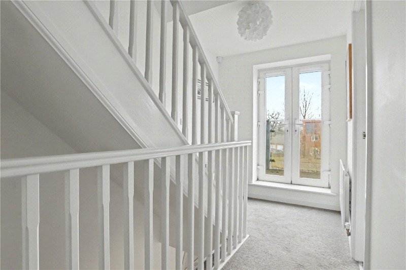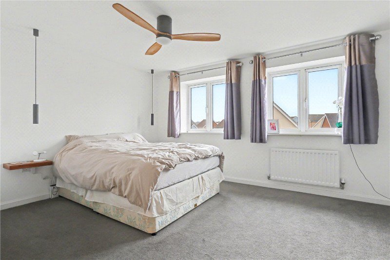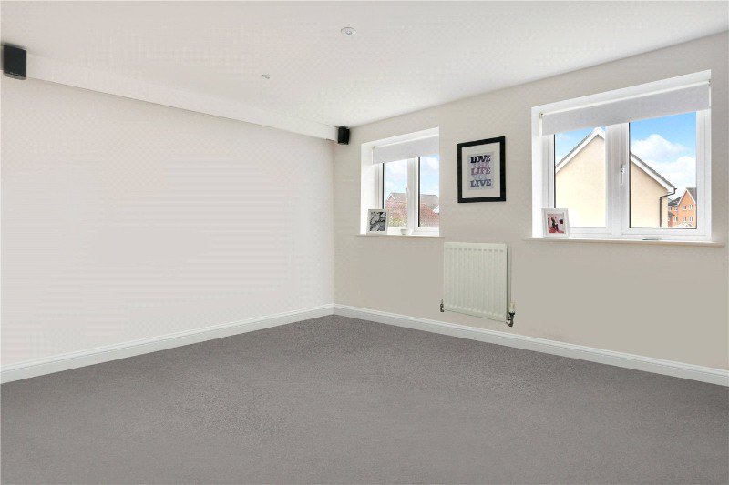 The first floor continues the home’s flexible theme. A generous reception room is located on this level, currently utilised as an additional lounge but equally well suited as a fourth bedroom, home office or playroom depending on individual needs. Measuring approximately 14ft by 13ft and featuring a Juliet balcony, this room benefits from excellent natural light. Also positioned on this floor is the third bedroom, which enjoys double doors opening onto the balcony and pleasant outlooks over nearby green space. The stylish family bathroom is also found on this level.