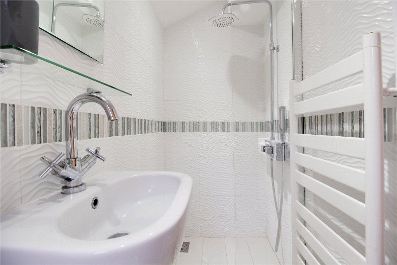 The bathroom has been imaginatively tiled and offers a clean matched white suite.