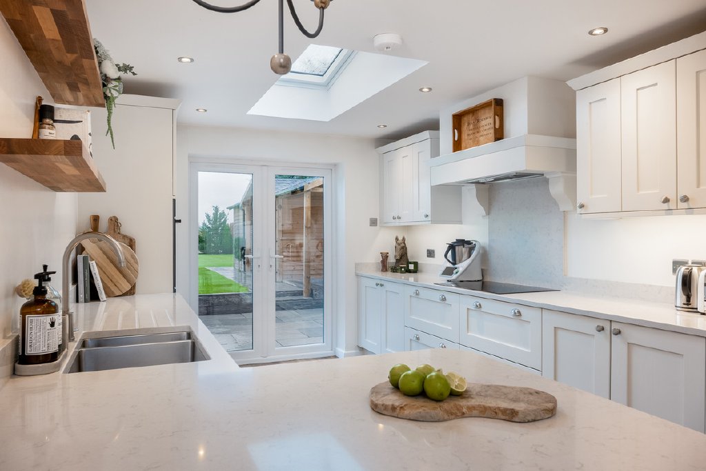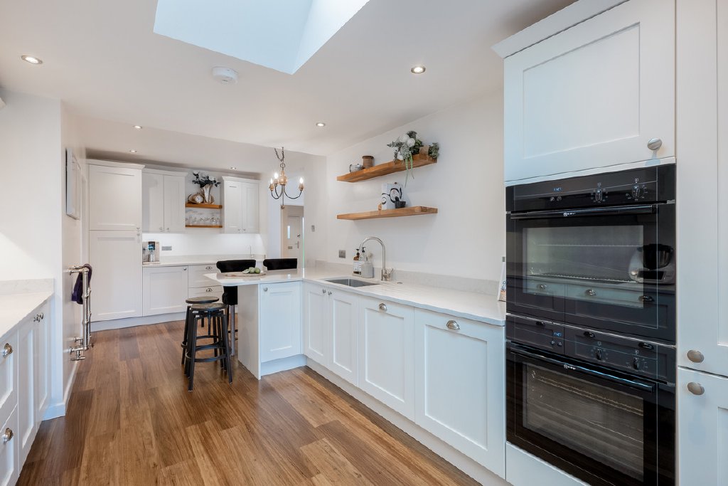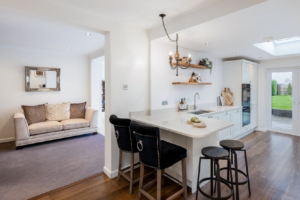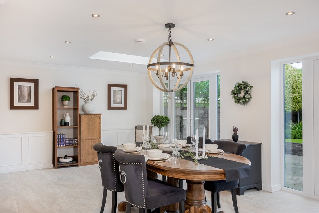 At the heart of the home lies the kitchen, a highly sociable space offering everything expected of a modern family kitchen. Features include a breakfast bar, French doors opening onto the rear garden, and a range of integrated appliances comprising double Neff ovens, an induction hob with extractor, an integrated fridge freezer and dishwasher. The kitchen flows naturally into the family room, linking the living and dining areas and creating a versatile hub for modern family life.