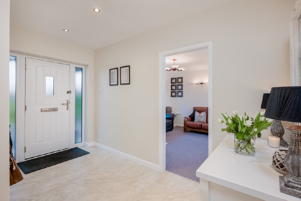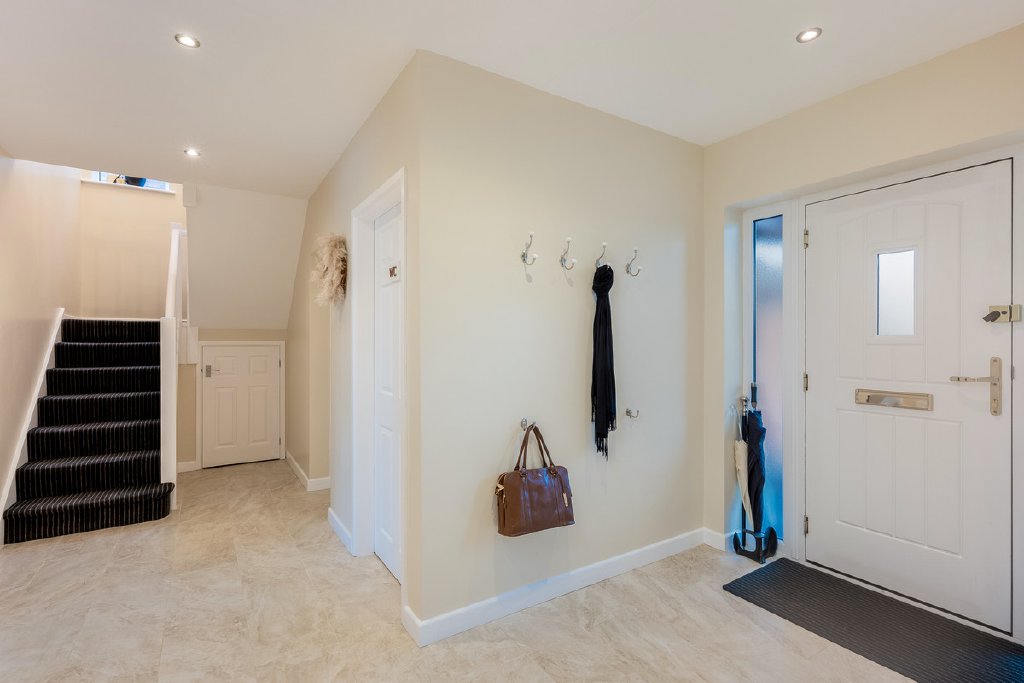 A wooden framed porch opens into a bright and welcoming entrance hall, offering ample storage and creating a natural, seamless flow through the ground floor living accommodation.