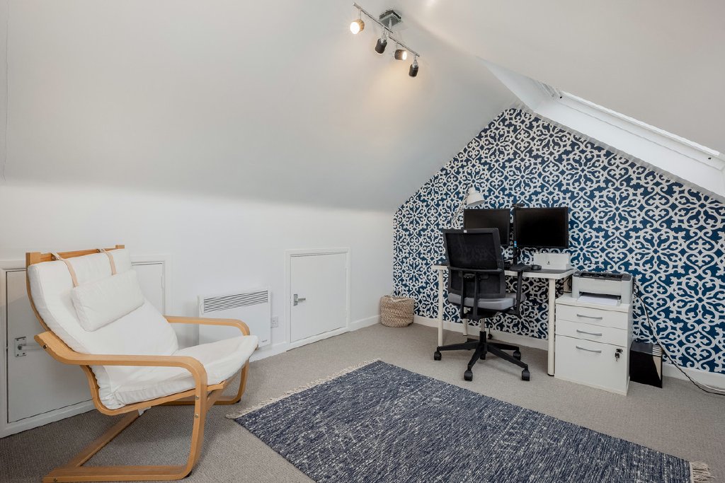 The second floor offers a further spacious room, currently used as a generous home office, though equally suited as a guest bedroom. This level is complemented by excellent eaves storage and a substantial storeroom, providing a degree of flexibility rarely found in homes of this style.