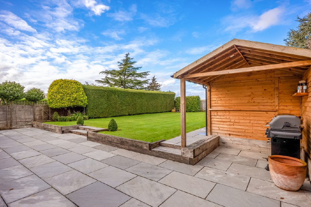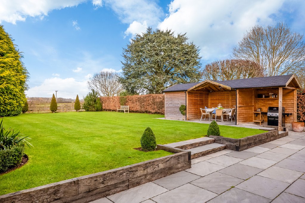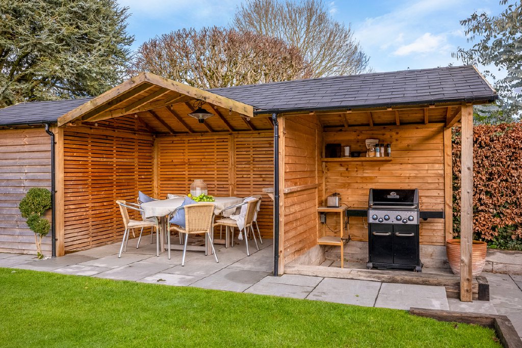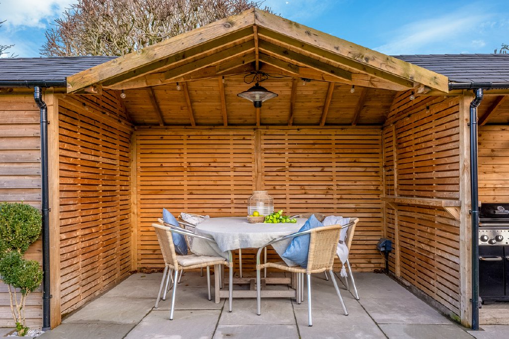 A superb terrace spans the width of the house and leads to a wonderful, covered seating area with barbecue facilities, creating an ideal space for al fresco dining, entertaining and relaxing while enjoying open countryside views.