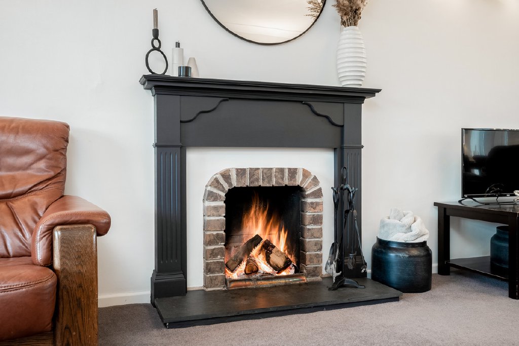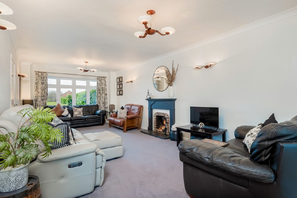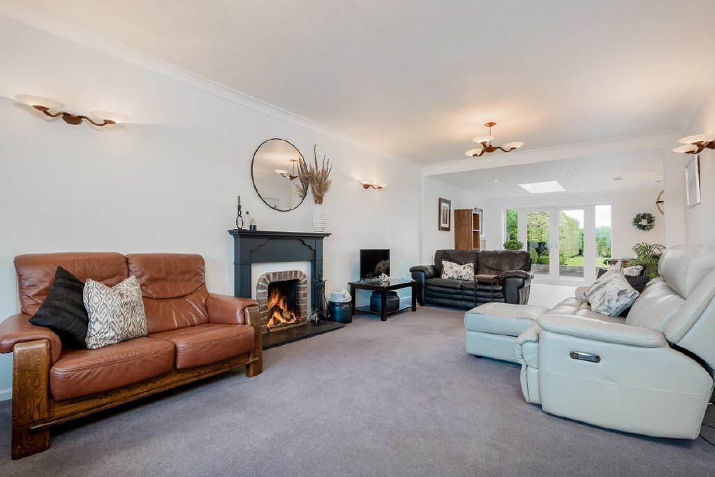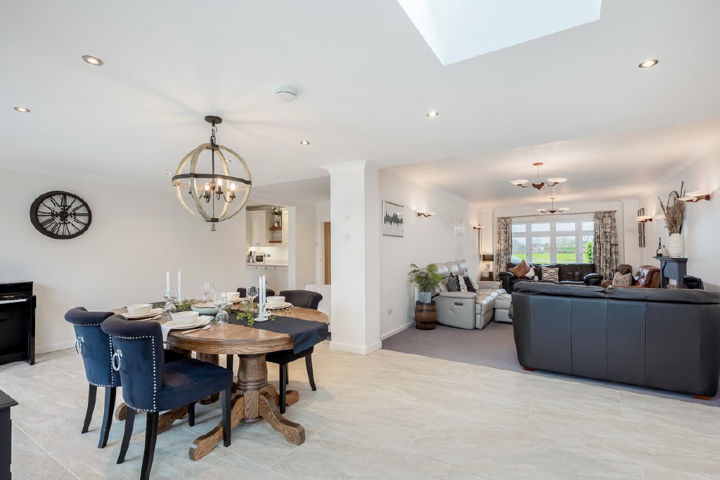 The impressive open-plan living and dining space is flooded with natural light from dual-aspect windows and offers clearly defined areas for both relaxation and entertaining, with the sitting area centred around a striking open fireplace.