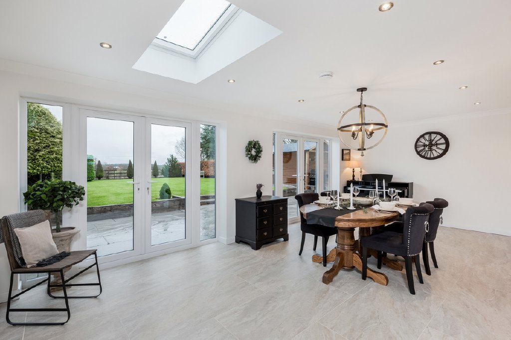 The stylish dining area features tiled flooring and connects seamlessly with the outside entertaining space via two sets of French doors, providing an ideal setting for both everyday living and larger gatherings, while enjoying attractive outlooks across the gardens.