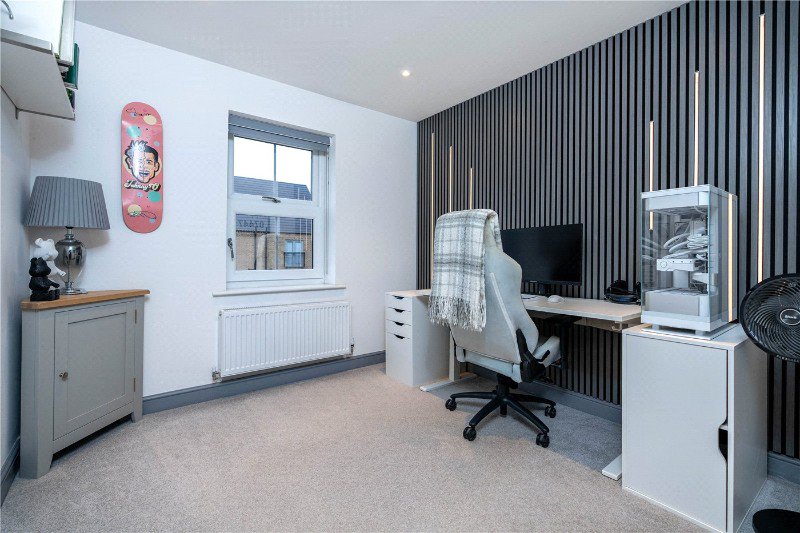 To the rear is a spacious and light-filled lounge with neutral decor, modern flooring and bifold doors opening onto the garden making it the perfect room to bring the outside in during the summer. The flooring downstairs has underfloor heating and electric blinds.