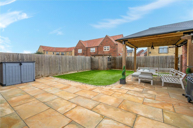 The rear garden has been designed with low maintenance and entertaining in mind. A large paved patio provides plenty of space for outdoor seating and summer gatherings, while the neatly laid artificial lawn offers a clean, usable area all year round. A standout feature is the covered pergola, creating a brilliant sheltered space for dining, relaxing or hosting friends, complete with lighting and space for a barbecue.