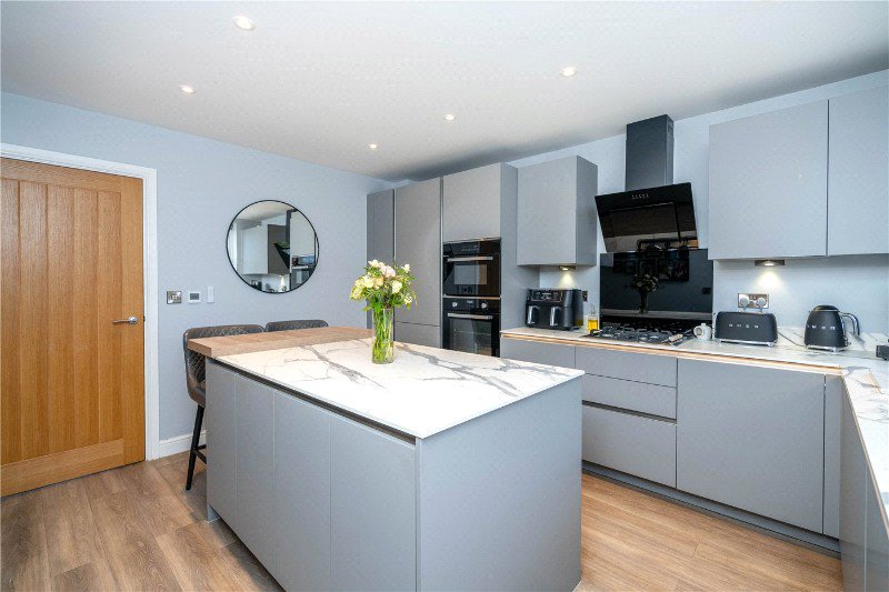The entrance hall gives a welcoming first impression and provides access to a handy ground floor cloakroom. From here, you step into the kitchen/diner, which is both practical and stylish. Fitted with modern units and integrated appliances, it offers plenty of space for cooking, and also boasts a central island with breakfast bar area.