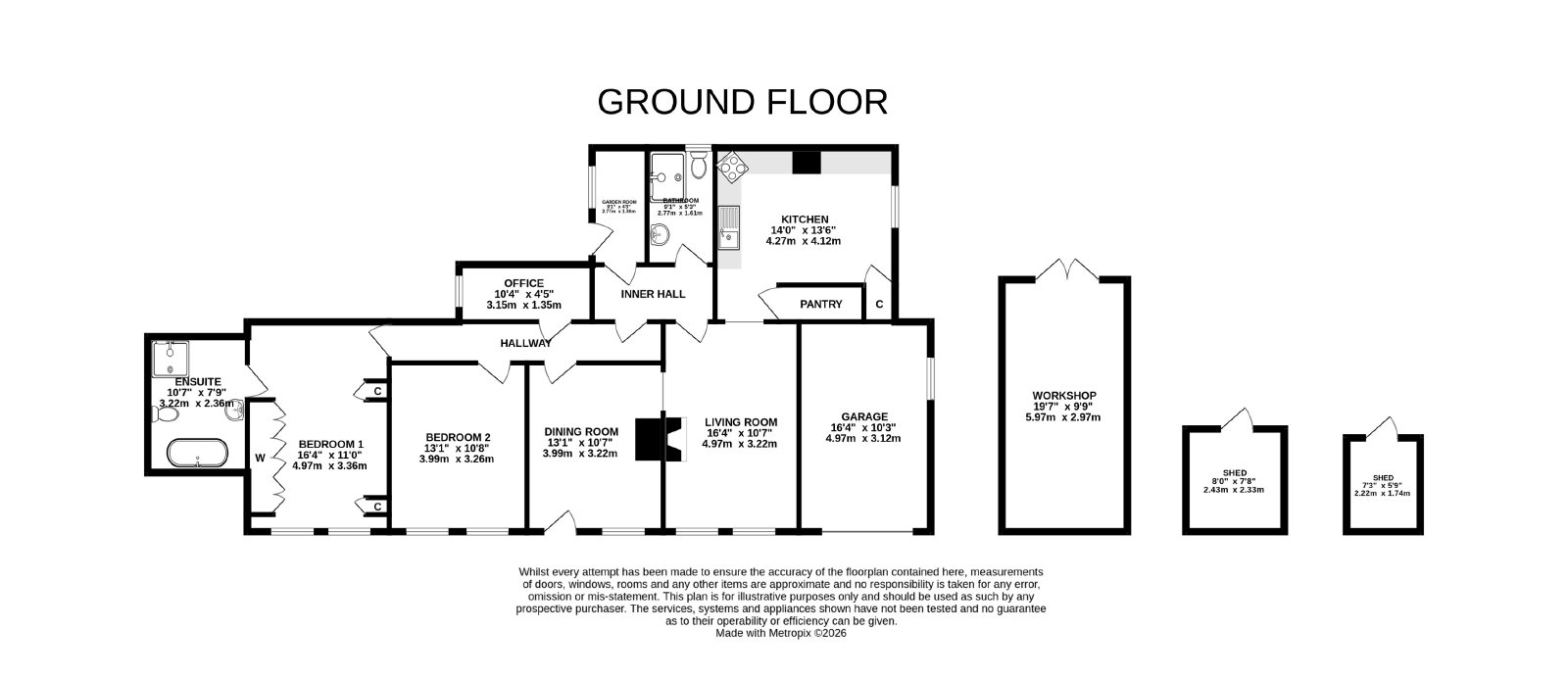 To the rear of the property, there is an enclosed garden to one side, with additional storage located to the other.