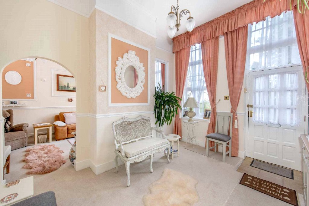The approach to St Catherine’s sets the tone perfectly, with a gravel driveway flanked by ornamental trees leading to a generous circular parking area to the front, together with an attached garage. A raised patio adjoining the front of the property is ideally positioned to enjoy views across the gardens.