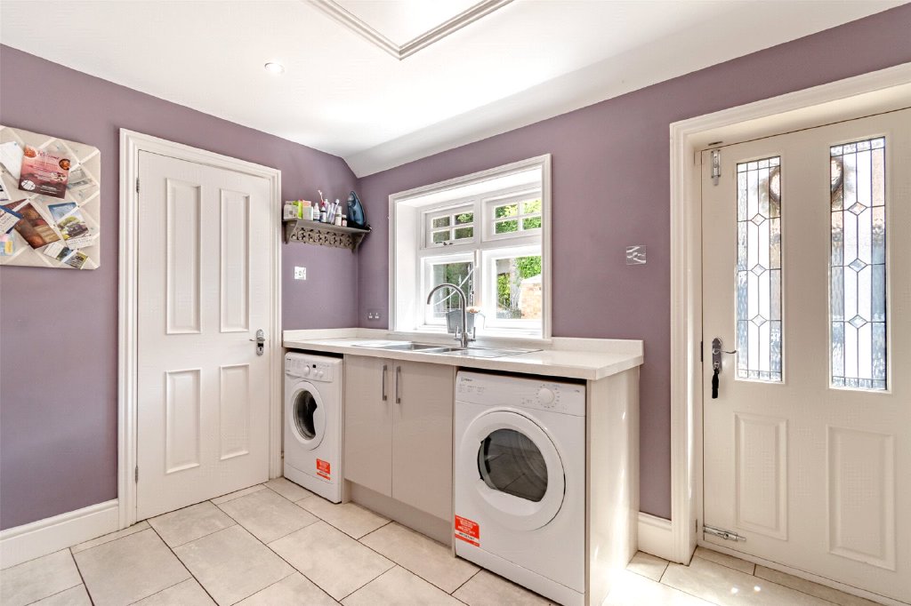 Utility Room 11'9" x 8' (3.58m x 2.44m). Door to side. Window to side. Tiled flooring. Plain ceiling with downlights. Access to small loft. Radiator. Fitted wall and base units with marble surfaces over. One and a half bowl stainless steel sink and drainer unit with mixer taps. Spaces for washing machine and tumble dryer.