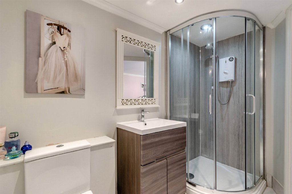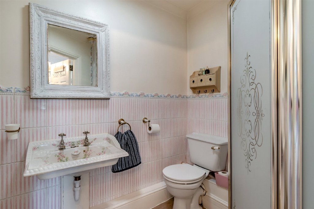 En-Suite Shower Room 6'10" x 5'6" (2.08m x 1.68m). Vinyl flooring. Plain coved ceiling. Heated towel rail. Heritage wash hand basin. Shower cubicle. Low level WC. Part tiled walls.