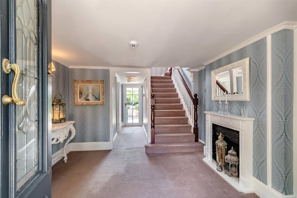 Entrance Hall 21'11" x 11'3" (6.68m x 3.43m). Panelled period style door to front with leaded light effect window. Carpet. Plain coved ceiling. Radiator with cover. Storage cupboards. Period style fireplace. Stairs leading to landing. Glazed door to rear.