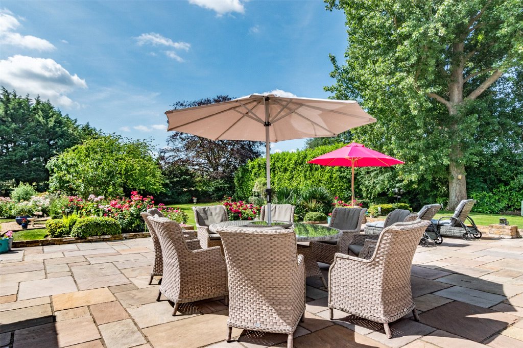 Rear Garden Total Plot Size 0.86 Acres. Covered rear paved sandstone patio area. Lawn areas. Flower beds. Gravel paths. Tractor store. Pagoda. Mature hedging. Well stocked with various plants and trees.