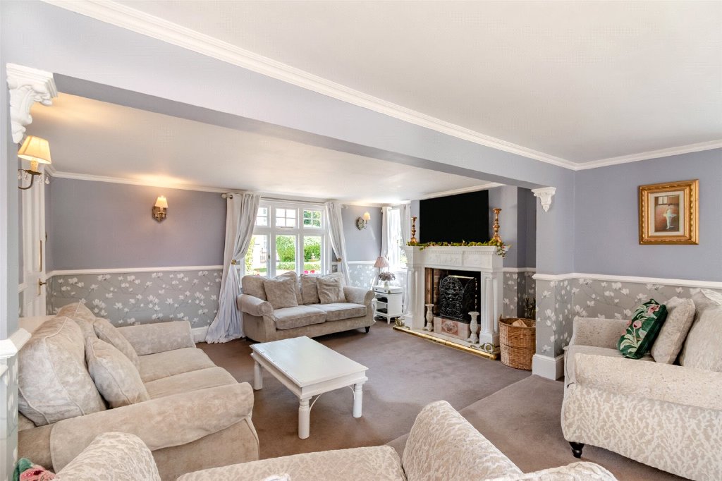 Sitting Room 21'11" (6.68m) x 18'10" (5.74m) narrowing to 15'10" (4.83m). Window to front. Two windows to side. Carpet. Split level floor. Plain coved ceiling. Dado rail. Period style working fireplace.