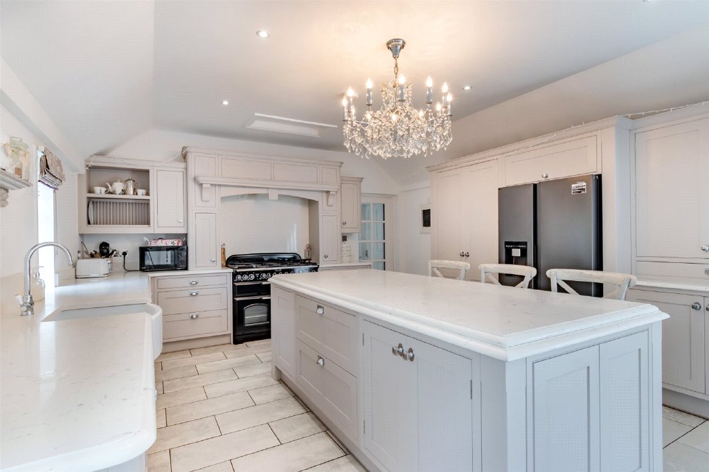 Kitchen/Breakfast/Dining Room 26'6" x 15'9" (8.08m x 4.8m). Two windows to front. French doors to rear. Tiled flooring. Plain ceiling with downlights. Radiator. Fitted wall and base units with island and marble work tops over. Butler sink with mixer taps. Integrated dishwasher. Rangemaster gas range. Space for fridge/freezer.