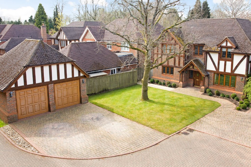 The property is approached via electric gates opening into the private road, where the home then has a block-paved driveway, providing ample parking and access to a detached double garage constructed in a complementary style to the main house.