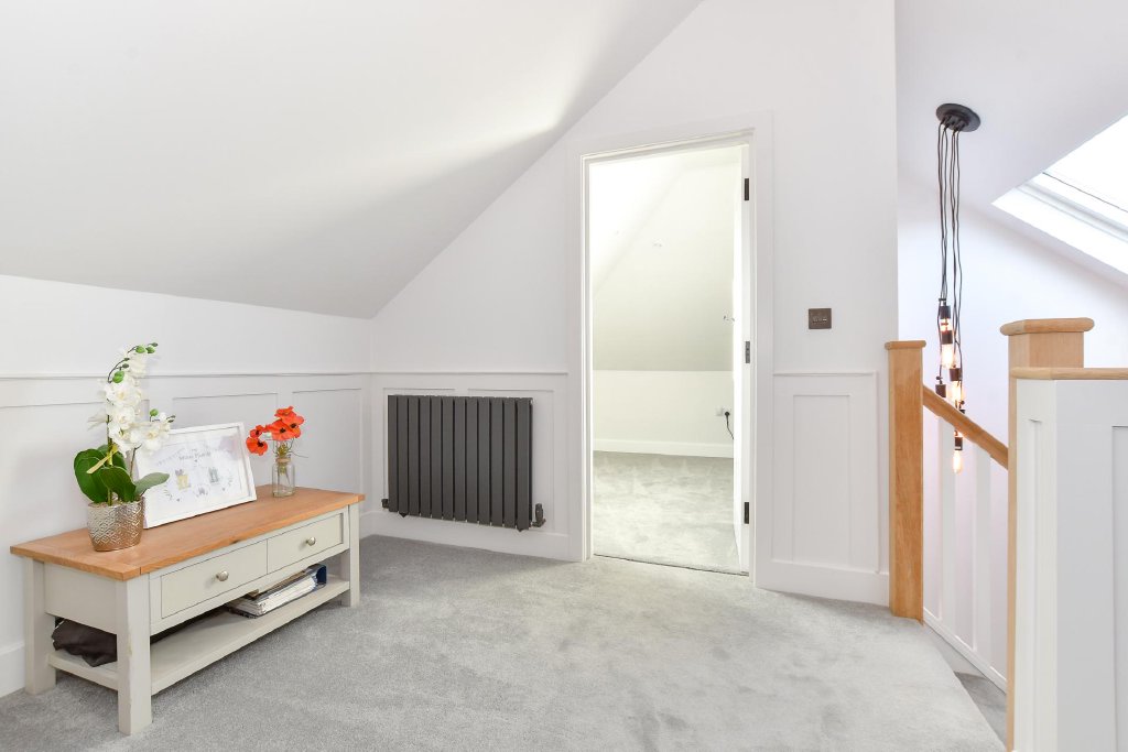 Further ground floor accommodation includes a well-equipped utility / boot room housing the boiler and additional storage, cleverly concealing a stylish contemporary shower room behind matching cupboard doors. An elegant family bathroom, fitted with high-quality fixtures, contemporary tiling, and a freestanding bath, completes this level, alongside the standout cinema room, perfect for immersive home entertainment.