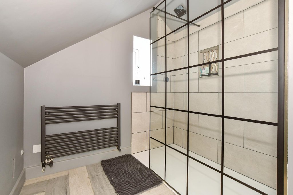 A bespoke staircase leads to the first floor, opening onto a spacious landing. Here you will find a further double bedroom, along with the impressive principal suite positioned to the rear of the property. Both rooms benefit from automated Velux windows and underfloor heating. The principal suite is further enhanced by a walk-through dressing room and a luxurious en-suite shower room, featuring a large walk-in shower, floating WC, and vanity unit with integrated storage.