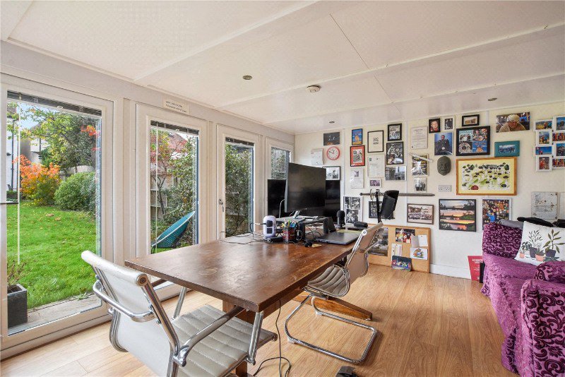 Externally, the property boasts a substantial private rear garden, a rare and peaceful retreat ideal for family life and summer entertaining. Positioned at the end of the garden is a detached studio, providing versatile additional space that could serve as a home office, gym or creative studio.