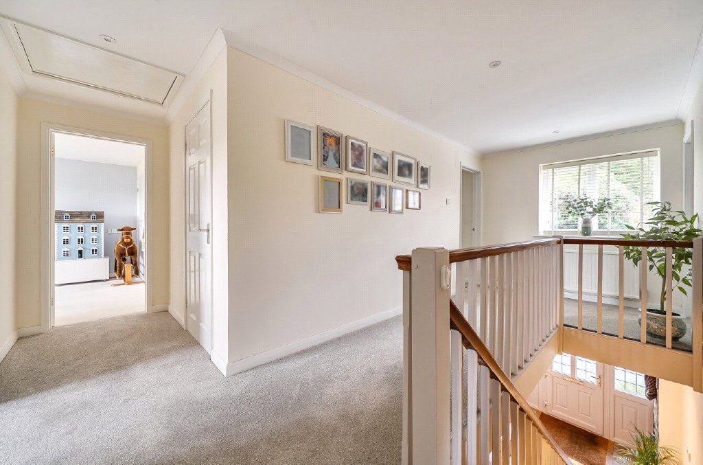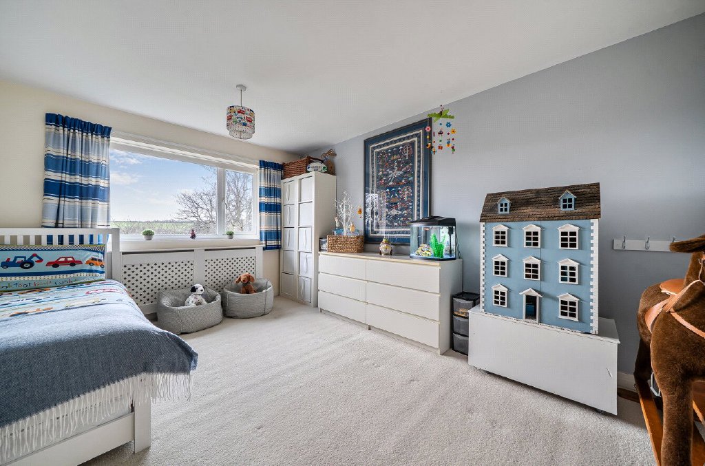 Outside, a large, gated driveway and double garage with electric doors provide ample parking for multiple vehicles, while the sweeping rear lawn, bordered by mature trees – including three spectacular magnolias – and established planting, draws the eye towards truly beautiful countryside views. They say, ‘south-east facing, we’ve never grown tired of the outlook in all the years we’ve lived here – it’s something we quickly fell in love with and have enjoyed throughout the seasons.’