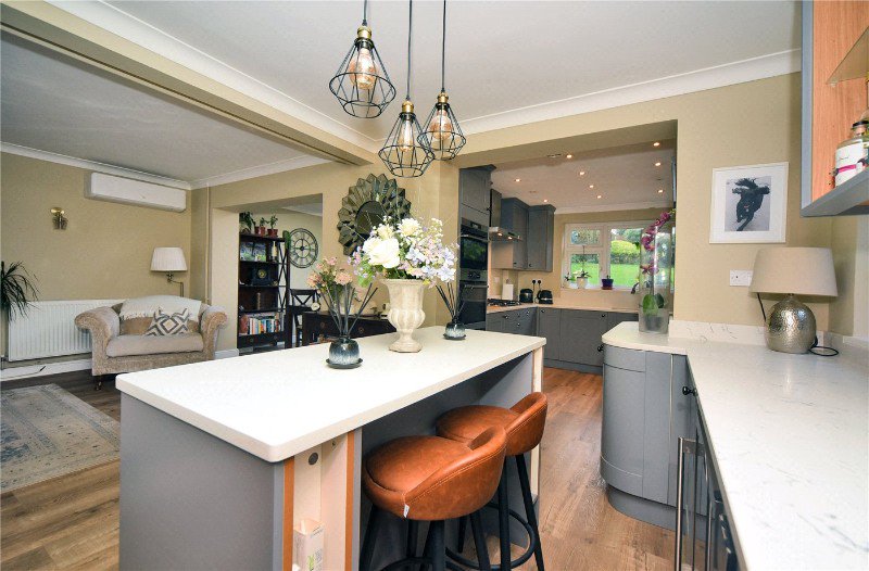 The ground floor has an open plan concept, benefiting from recently installed air-conditioning, and comprises; hallway, bathroom, spacious front aspect living room with feature recessed fire, a dining room with double doors giving direct access to the rear garden, a walk-through breakfast area with island leading to a well appointed modern fitted kitchen with contemporary satin finish, quartz worktops and integrated appliances, including a double oven and warming drawer.