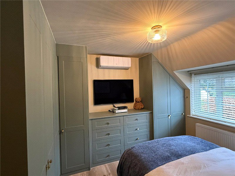 A turning staircase leads up to the first floor which has three bedrooms in total, all benefitting from fitted bespoke wardrobes, including recently installed Sharps wardrobes in the master bedroom, along with air-conditioning, and a well-appointed family shower room/wc.