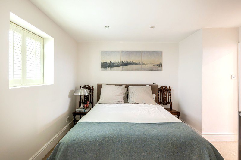 The first floor is devoted entirely to a luxurious principal suite. A striking Crittall-style glass partition subtly separates the sleeping area from a versatile sitting or dressing space. Bespoke wardrobes, elegant oak flooring, and a beautifully appointed en suite bathroom complete the level, with underfloor heating, a freestanding bath, and a walk-in rainfall shower.