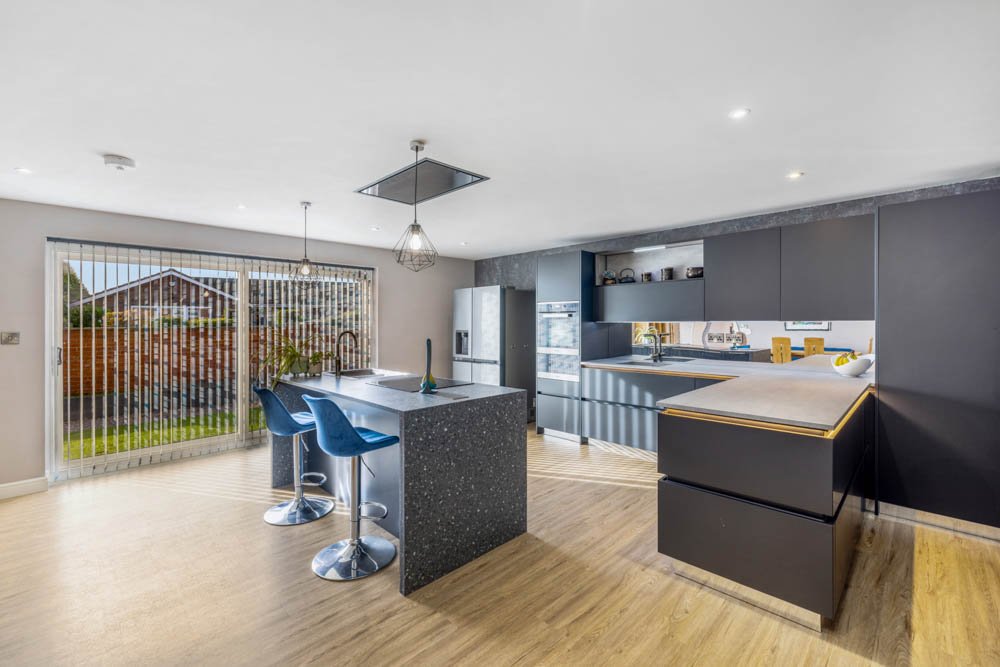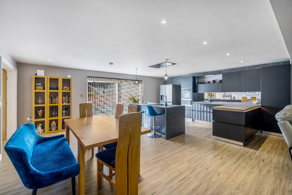 At the heart of the home is the magnificent open-plan kitchen, dining and living area. A striking floor-to-ceiling window serves as the focal point for this impressive space, flooding it with natural light and framing the woodland scenery at the rear of the property. The ground floor also boasts a spacious entrance hall, a well-appointed utility room, and two good-sized bedrooms, each with its own en-suite. Upstairs, you'll find further bedrooms, a contemporary family bathroom, and an expansive landing/living area that’s perfect for a home office or snug.