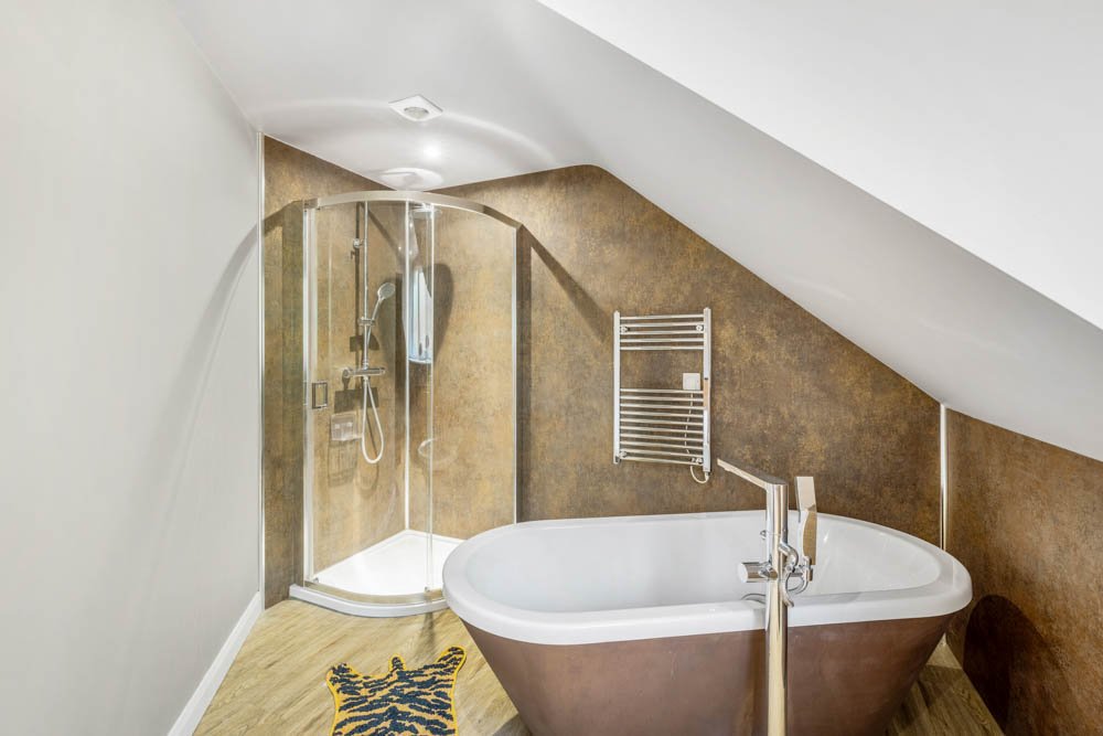 • Generous family bathroom with a contemporary roll-top bath and quadrant shower