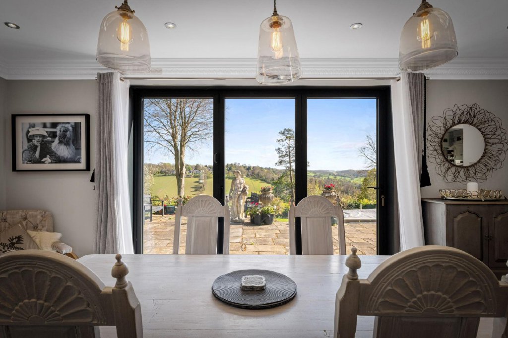 On entering the main residence, the magnificent reception hall provides an equally impressive welcome, being open plan to a study area with views towards the rear gardens via one of the many bifolding doors. The drawing room, a double aspect room, also with bifolding doors opens out onto a covered and protected sun loggia. From here the panoramic outlook sweeps across the valley, creating a seamless indoor-outdoor living experience. A well proportioned room with a feature stone fireplace with gas coal fire. At the heart of the home, the open plan kitchen/living/dining area is a true statement piece, boasting a Mark Wilkinson, solid wood kitchen with cabinetry, finished in an eye-catching light grey, with a central island unit with wine cooler and secondary sink, and overall, cleverly integrated storage, all combine to create both beauty and functionality. High specification appliances include Bosch, Miele and a Fisher & Paykel oversized American fridge/freezer, ensuring the kitchen is as practical as it is stylish. Open plan in design, this space flows into the dining and living areas, making is ideal for both family life and entertaining. A dedicated coffee station with hot water tap further elevates everyday convenience. Three sets of bifolding doors access and open up to the rear garden, with a striking Japanese silk tree, visible, adding charm and character to the overall setting from all the living spaces.