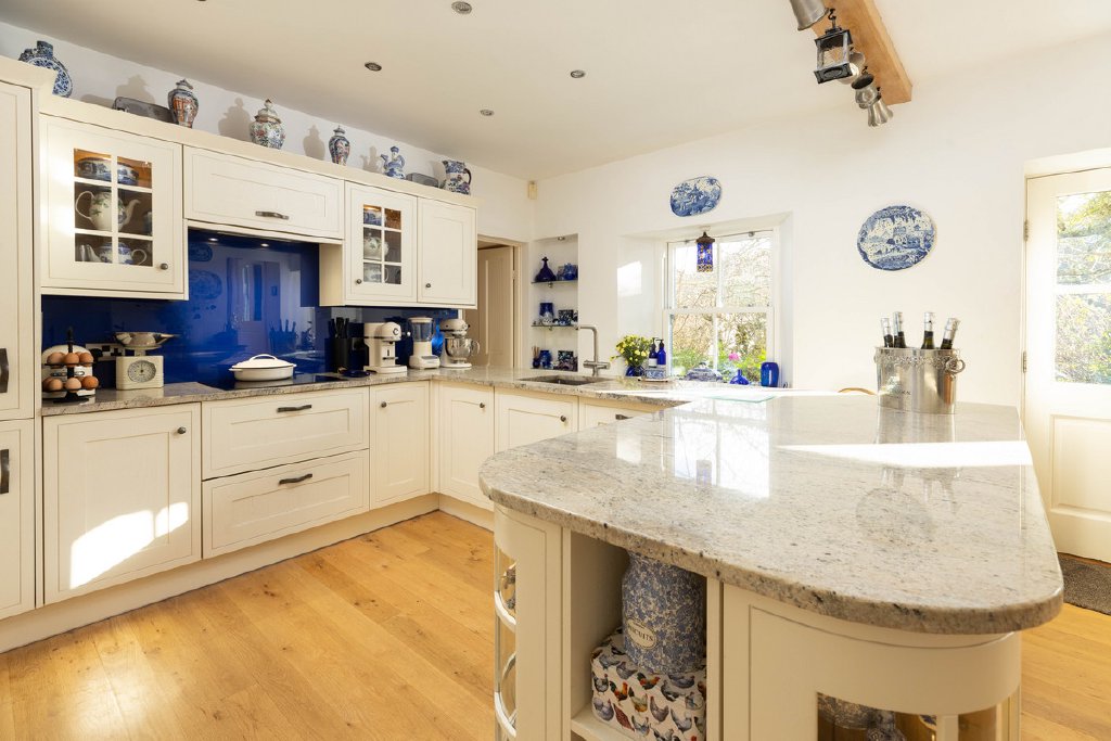Inside, the accommodation is generous and versatile, featuring two inviting reception rooms and a wonderful modern kitchen, blending traditional character with modern functionality. The kitchen is a superb asset to the property, fitted with beautiful solid stone worktops, a range of appliances and finished to an impeccable standard. Light filled reception rooms enjoy views over the gardens and terraces, and across the river to the countryside beyond, whilst also providing flexible space for entertaining or quiet contemplation. The bedrooms, some with views stretching over the water, provide peaceful, elegant spaces to unwind.