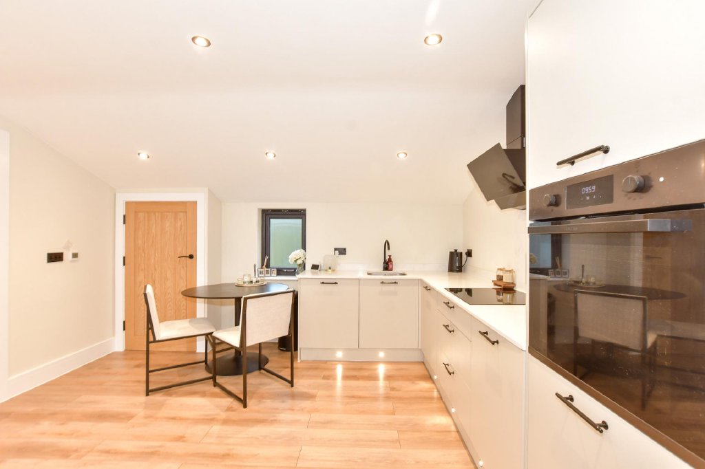 There is a large seating and dining area as well as a gorgeous Leicht kitchen designed by A. J. Ball. This consists of an island/breakfast bar with an induction hob and downdraft extractor. There are beautiful units housing high end appliances including a built in oven, combi microwave and a warming drawer as well as a full height larder fridge and matching freezer, a large temperature controlled wine fridge and a dishwasher. While the adjacent utility room has an additional built in oven, laundry facilities and a very spacious walk-in larder.
