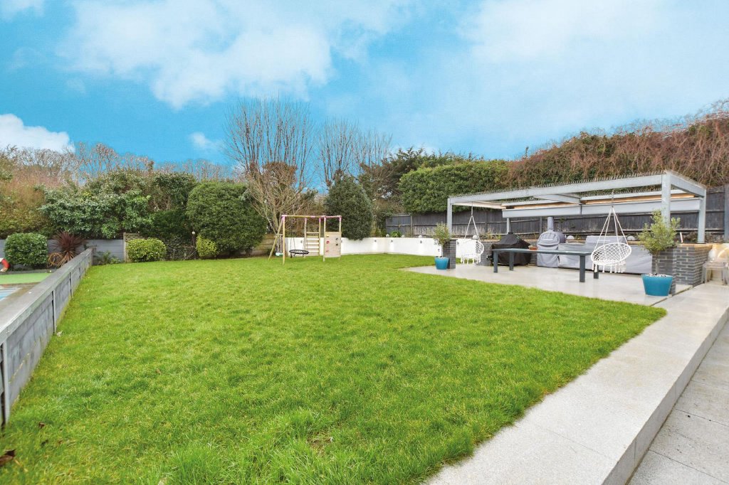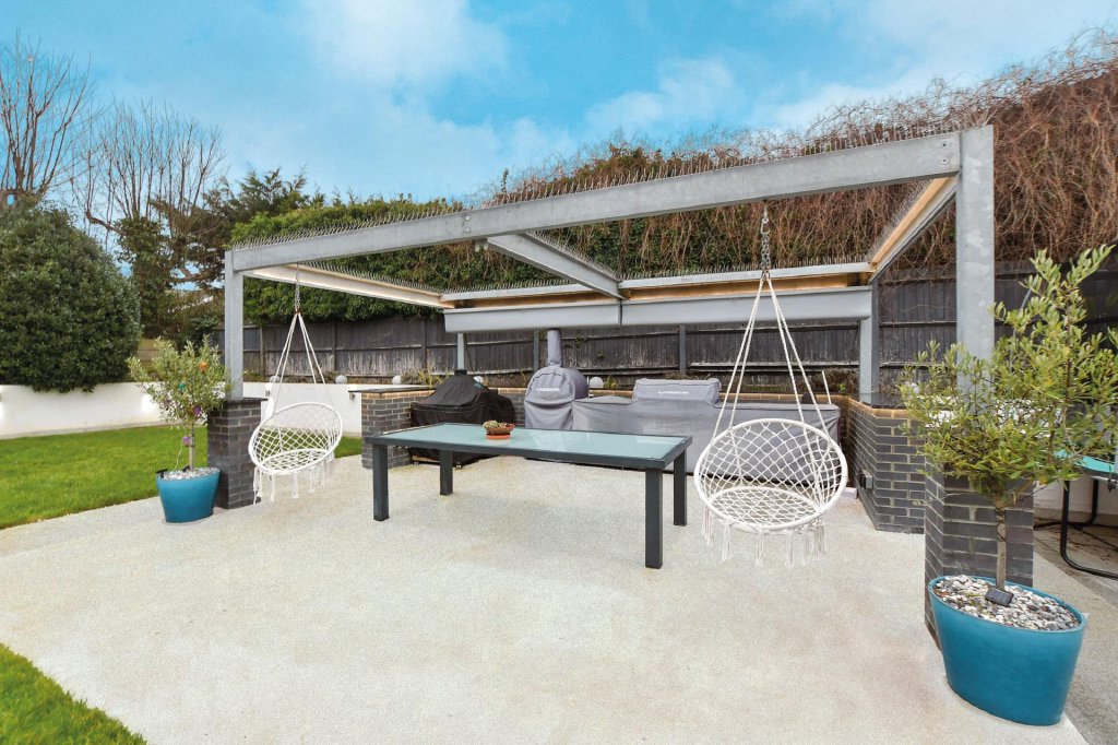 If leisure and pleasure are top of your list then the very easy to manage south facing rear garden is ideal. It consists of a resin patio with a large hot tub and an impressive sauna, astro turf around the heated swimming pool, a vast granite terrace bordered by a lawn and a pergola covered outdoor kitchen with a retractable roof. The kitchen includes a barbecue, pizza oven and a fridge.