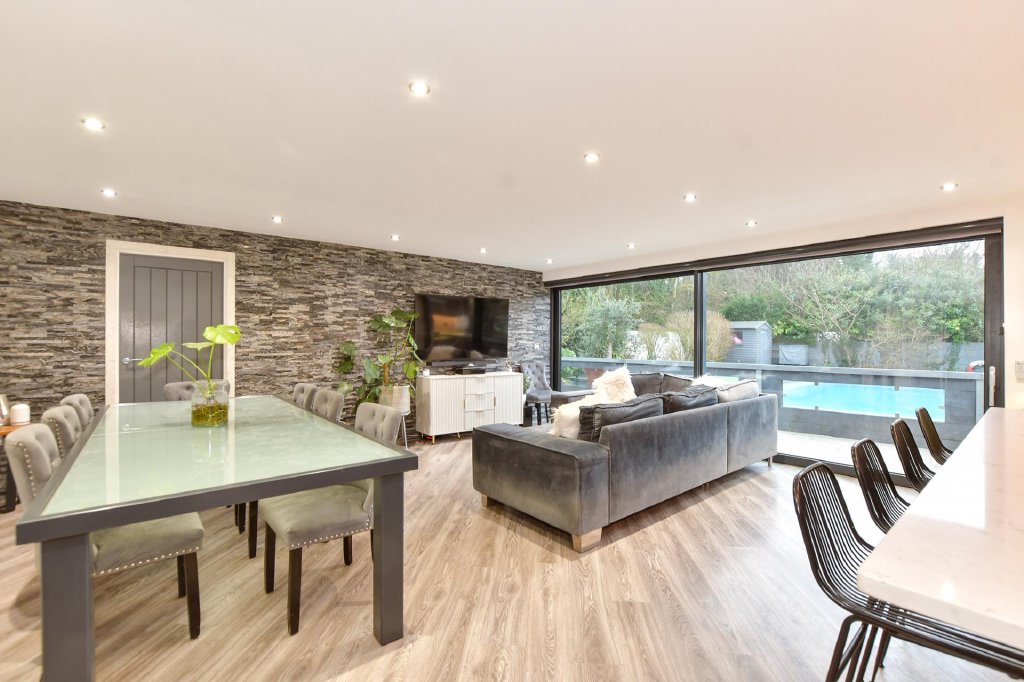 A spacious driveway where you can park a number of cars leads to the double garage, the annexe entrance and the very wide and contemporary front door. This opens into a charming double height entrance hall with a superb floating oak staircase and a glass balustrade as well as a large picture window providing plenty of natural light. It leads to a corridor with a double storage cupboard and access to much of the ground floor accommodation including the very impressive kitchen/lounge/living room with LVT flooring and underfloor heating that flows through many of the rooms, a feature split faced granite and quartz wall and vast patio doors to the terrace and swimming pool.