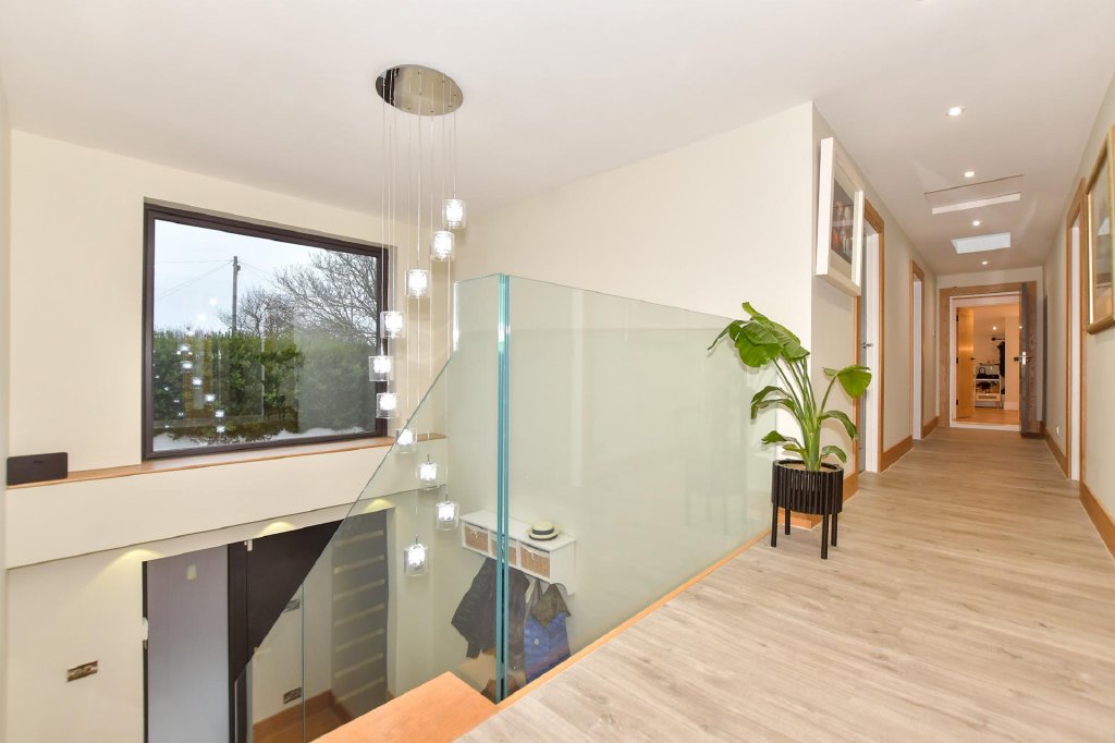 Upstairs there is a corridor with a skylight, a large airing cupboard and the plant room as well as a fabulous family bathroom with a walk-in shower, a stand-alone curved bath and a vanity basin plus a single bedroom with a wall of fitted cupboards that makes an ideal dressing room. You will also find a double bedroom with fitted cupboards and a guest double bedroom with fitted wardrobes, an ensuite bathroom with a Jacuzzi bath and patio doors to the delightful roof terrace where you can sit and sip your morning coffee admiring the view over the garden and beyond.