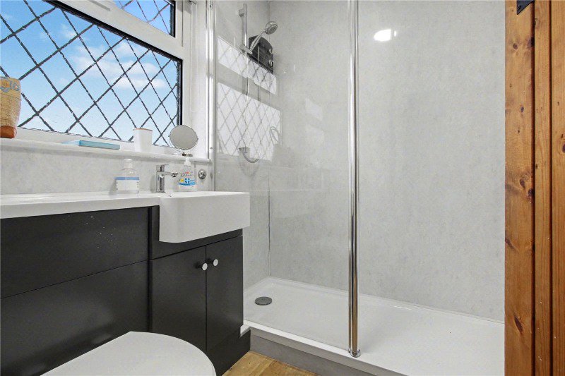 The bedrooms are well balanced and comfortably proportioned, with accommodation to both the front and rear of the property, allowing flexibility for family and guests alike. The family bathroom has been finished in a clean, modern style, featuring a large shower cubicle and vanity storage, creating a sleek and low-maintenance space.