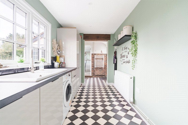 The former garage can be accessed from both the front drive and the rear garden. An entrance lobby leads to a kitchen housing the Vaillant LPG fired boiler. There is also a fully tiled wet room with basin and WC, a boot room and a staircase leading to the first floor bedroom.