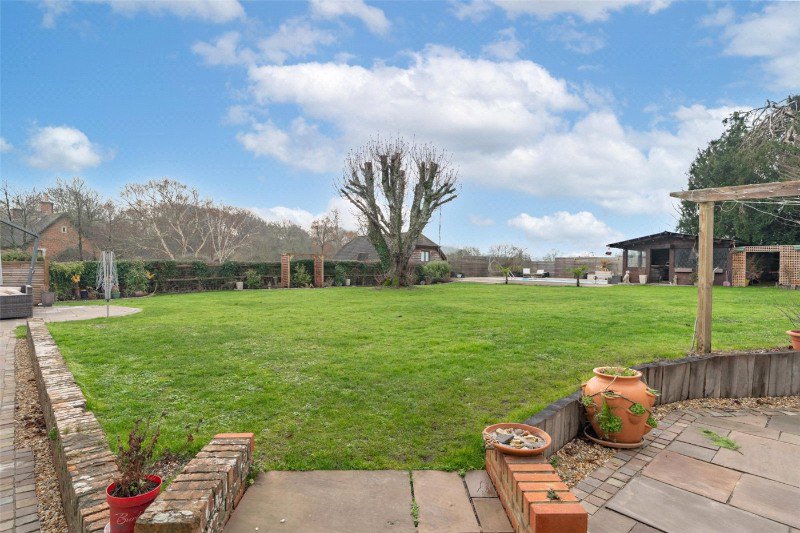 The rear garden is enclosed by close boarded post-and-rail fencing and mixed hedges, and features a large lawn with trees including chestnut, maple, conifer and fir, a potting shed and a garden storage area. There is an outdoor entertaining area with a large log cabin (with a bar). A deck houses a swimming pool heated by solar panels and a heat pump.
