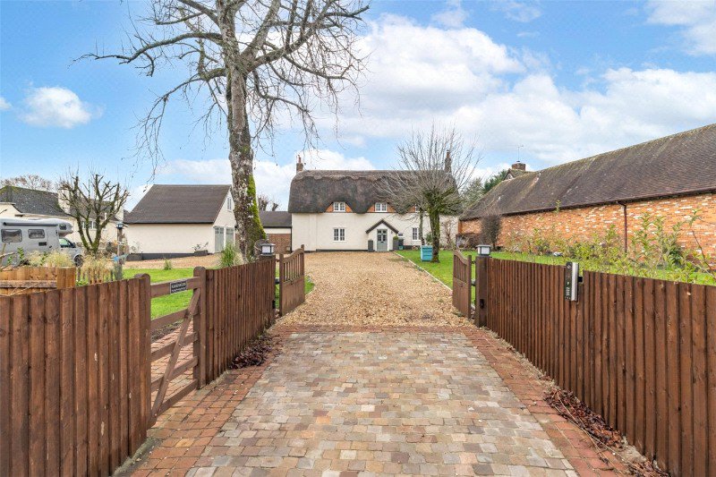 The cottage is set well back from the village road. Electric gates lead to a long driveway and a gravelled courtyard. There is an attached double garage (with ledged-and-braced double doors, lighting and power), and excellent parking.