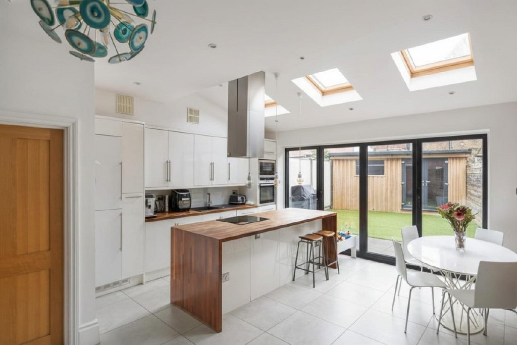 The heart of the home is a stunning open-plan kitchen, thoughtfully designed for both everyday living and entertaining. A central kitchen island anchors the space, complemented by a generous dining area and relaxed seating area, creating a true social hub. In addition, a separate reception room offers a quieter, more formal living space, ideal as a second lounge.