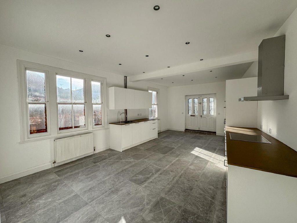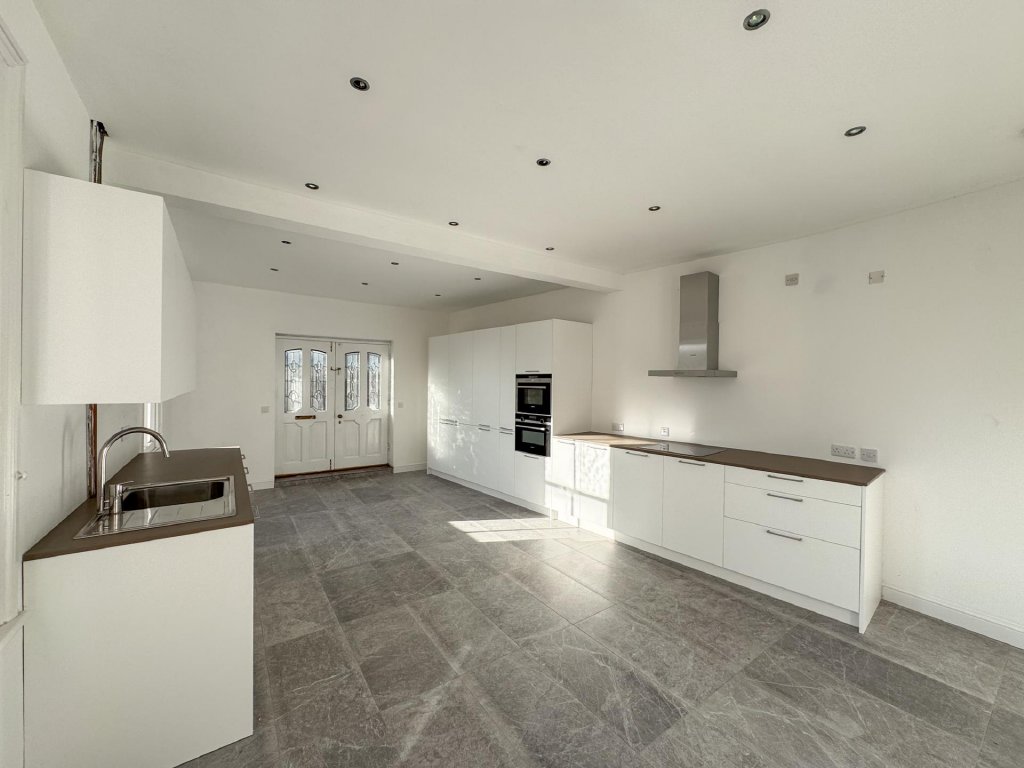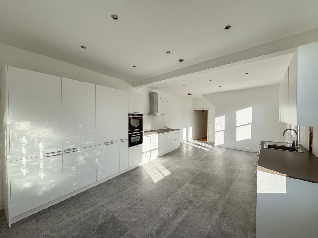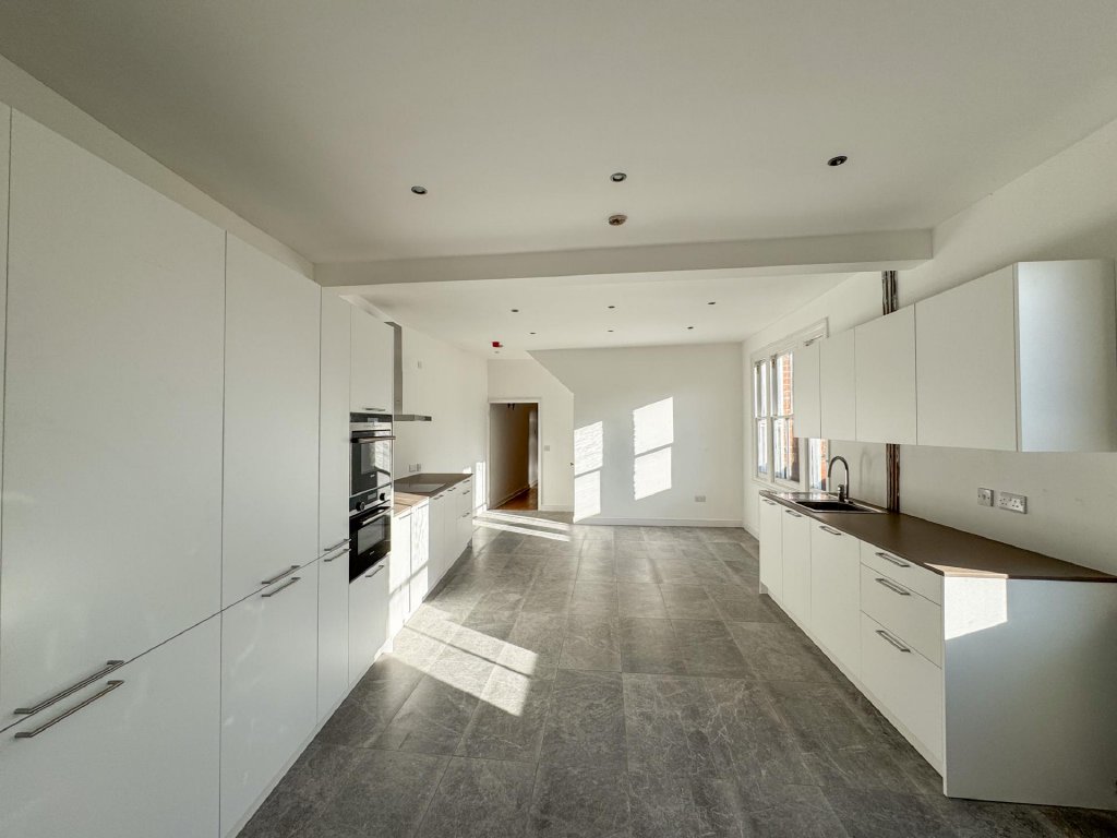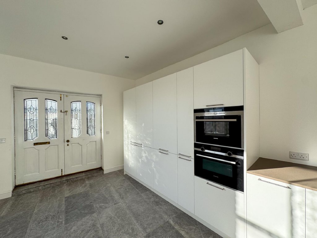To the rear, a recently installed kitchen provides a striking yet practical heart of the home. Generous in proportions and finished with sleek cabinetry, integrated appliances and natural stone flooring, this dual-aspect space enjoys French doors opening directly onto the garden, seamlessly blending indoor and outdoor living.