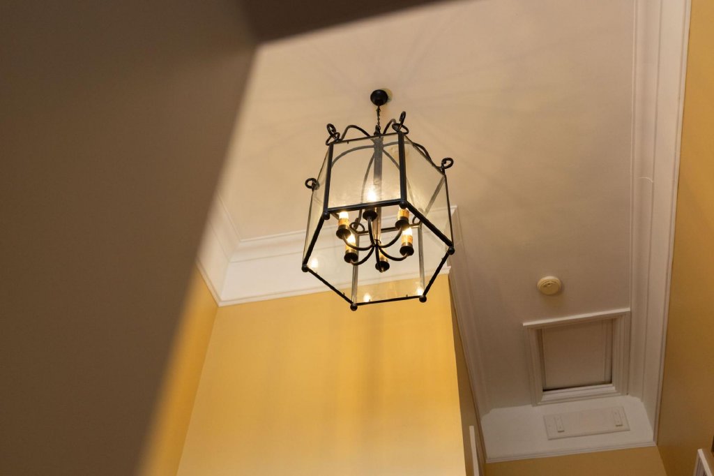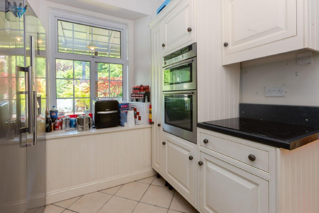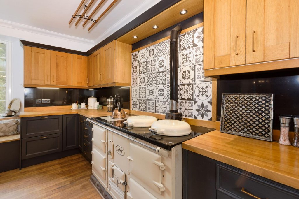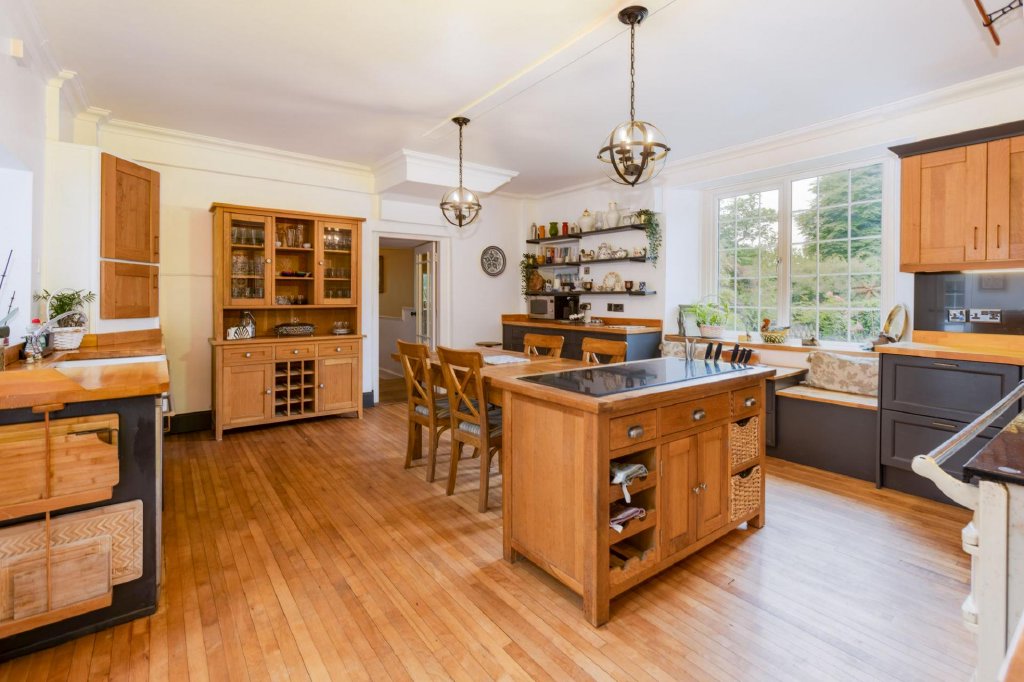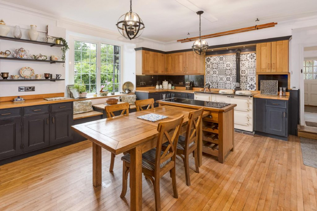 Returning to the main house, there is the dining room, featuring an ornate fireplace. The recently renovated kitchen boasts maple floors and worksurfaces, an oil-fired AGA, and a butler’s pantry complete with a double oven and induction hob. Adjacent to the kitchen is the newly constructed breakfast room—a light-filled space perfect for entertaining, with doors that open onto the patio and doors to the dining room.